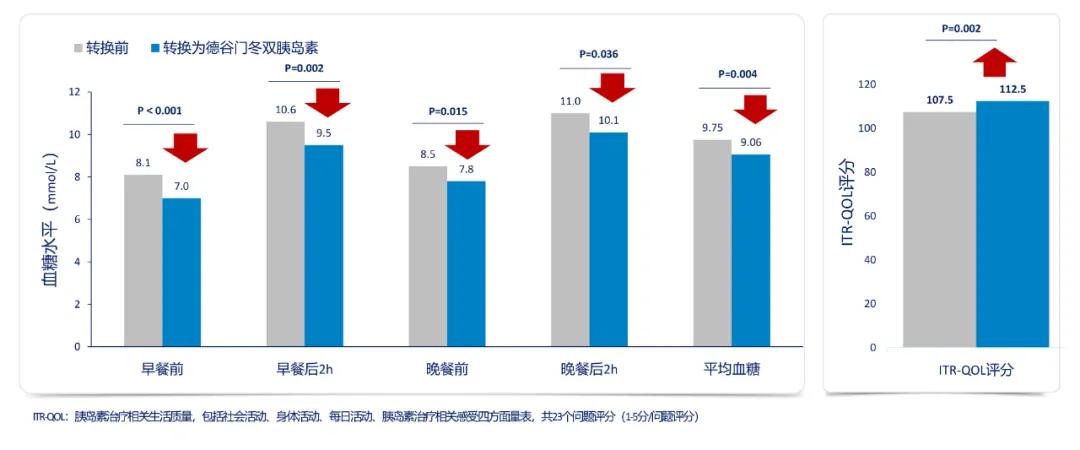 图4. 预混人胰岛素转为双胰岛素早晚餐前/后及平均血糖显著降低,患者生活质量得到改善