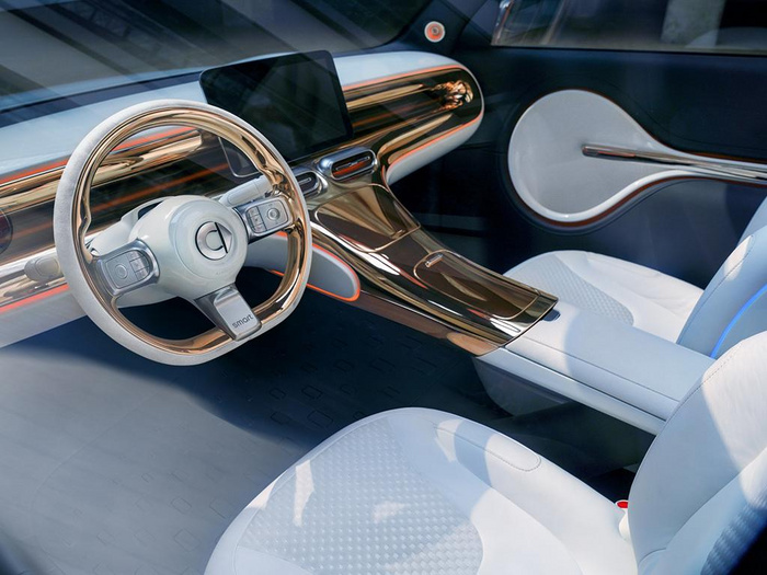 内饰上,能看到奔驰最新的设计语言,悬浮式中控屏匹配“smart宇宙”智能人机交互系统,为该车带来不少科技感。同时在出风口、仪表盘等位置均采用了环形元素设计,在时尚感方面也增色不少。此外,方向盘也采用了奔驰最新样式的设计,并在下方印有smart字样。别的不说,这个中控的造型说明奔驰设计部门还是在线的,简约不掉档次,虽然用了俗套的金色装饰,但我们相信拿掉装饰件,再换个材料,它的颜值还是好的。