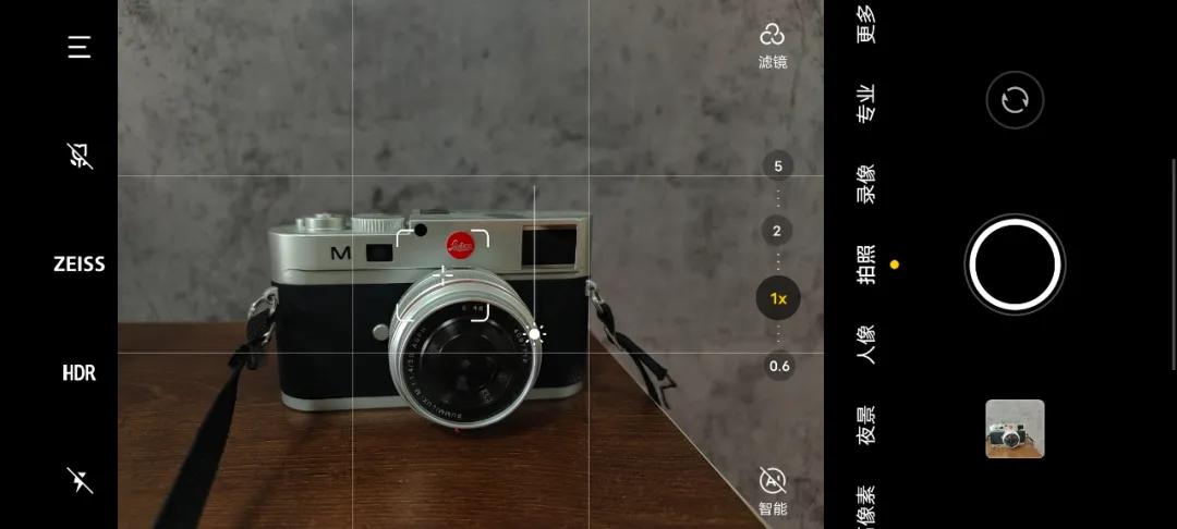 在拍摄界面的上方,是一些拍摄功能设置,由左到右分别是:闪光灯(通常关闭)、HDR、Zeiss、超微距、设置(构图线、倒计时、画幅、设置)。