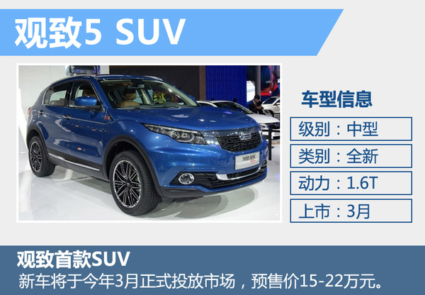在过去的2015年,观致汽车经过一系列架构调整及品牌重新定位,并于年底发布了全新中型SUV—观致5 SUV。今年1月18日举行的媒体沟通会上,观致官方确认观致5 SUV将于今年3月向各大经销商铺货,正式投放市场。新车搭载一台1.6T涡轮增压发动机,目前已接受预定,预售价格区间为15-22万元。