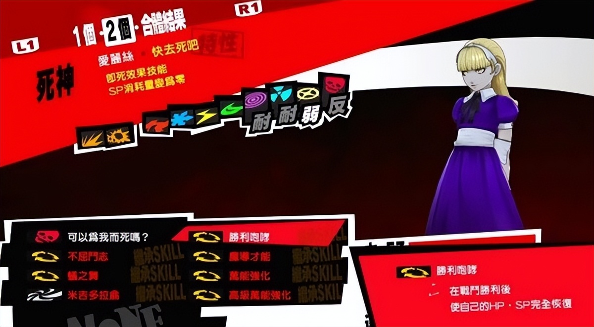 面具特性继承:特性是P5R新加的要素,例如大神的【如产国之举】,但该特性是大神的特有特性无法继承给别的面具。其它特性例如【剑神的意志】就可以通过合体来继承,例如A面具的特性为【剑神的意志】,B面具特性为【究极不灭的怒发冲冠】,将A和B面具合体得到C面具,C面具就可以继承【剑神的意志】和【究极不灭的怒发冲冠】。