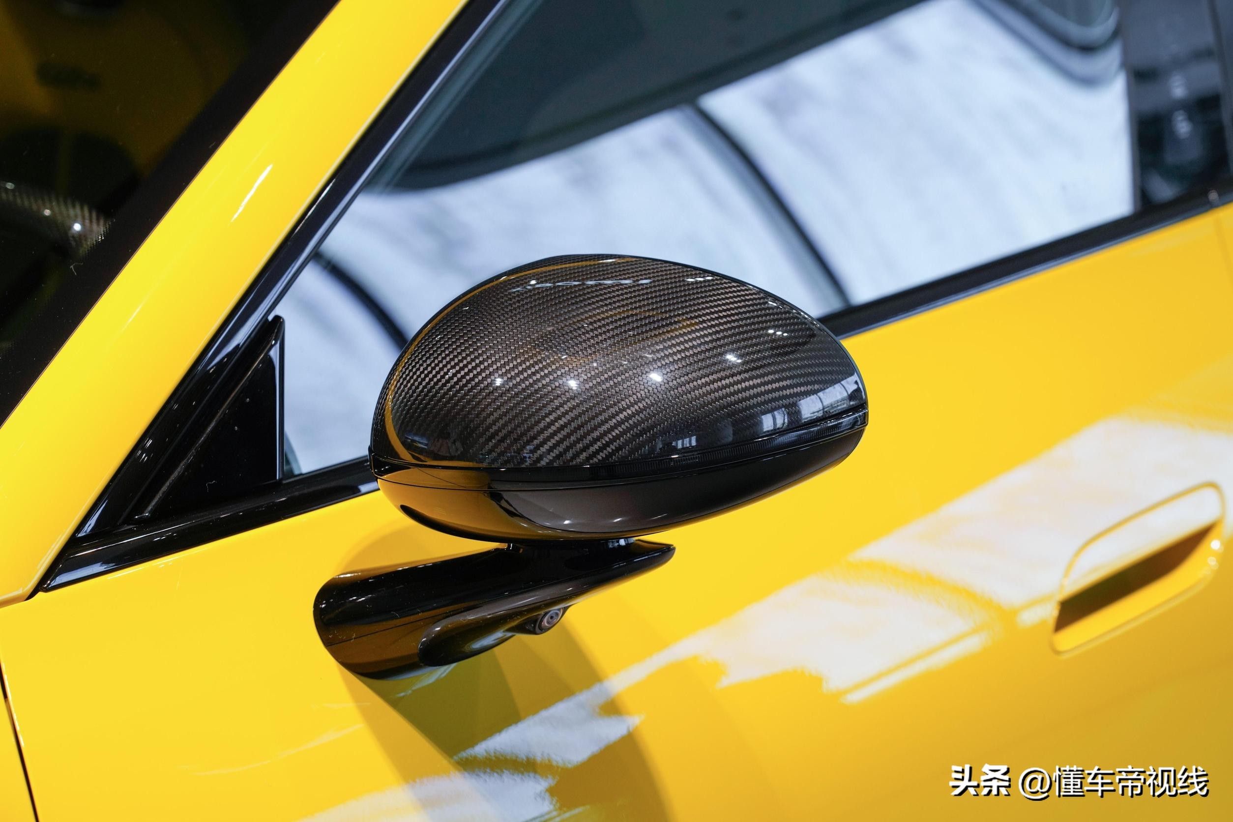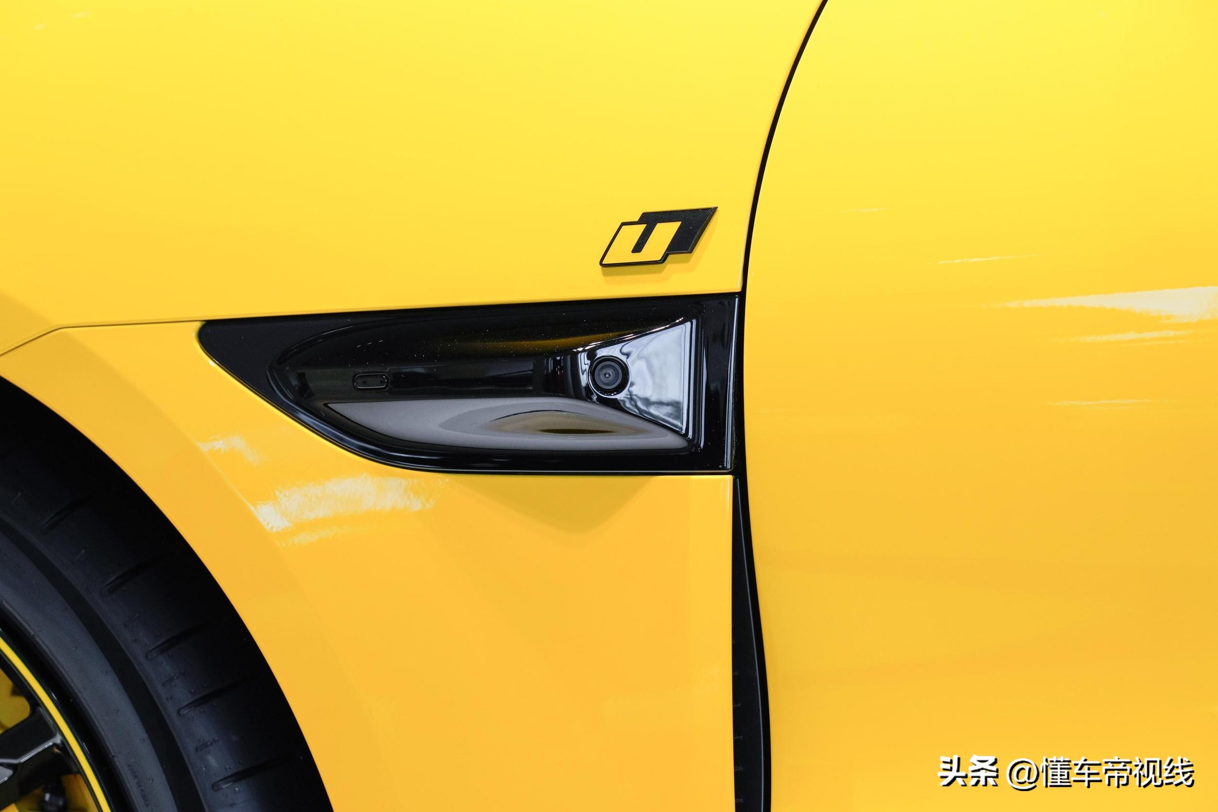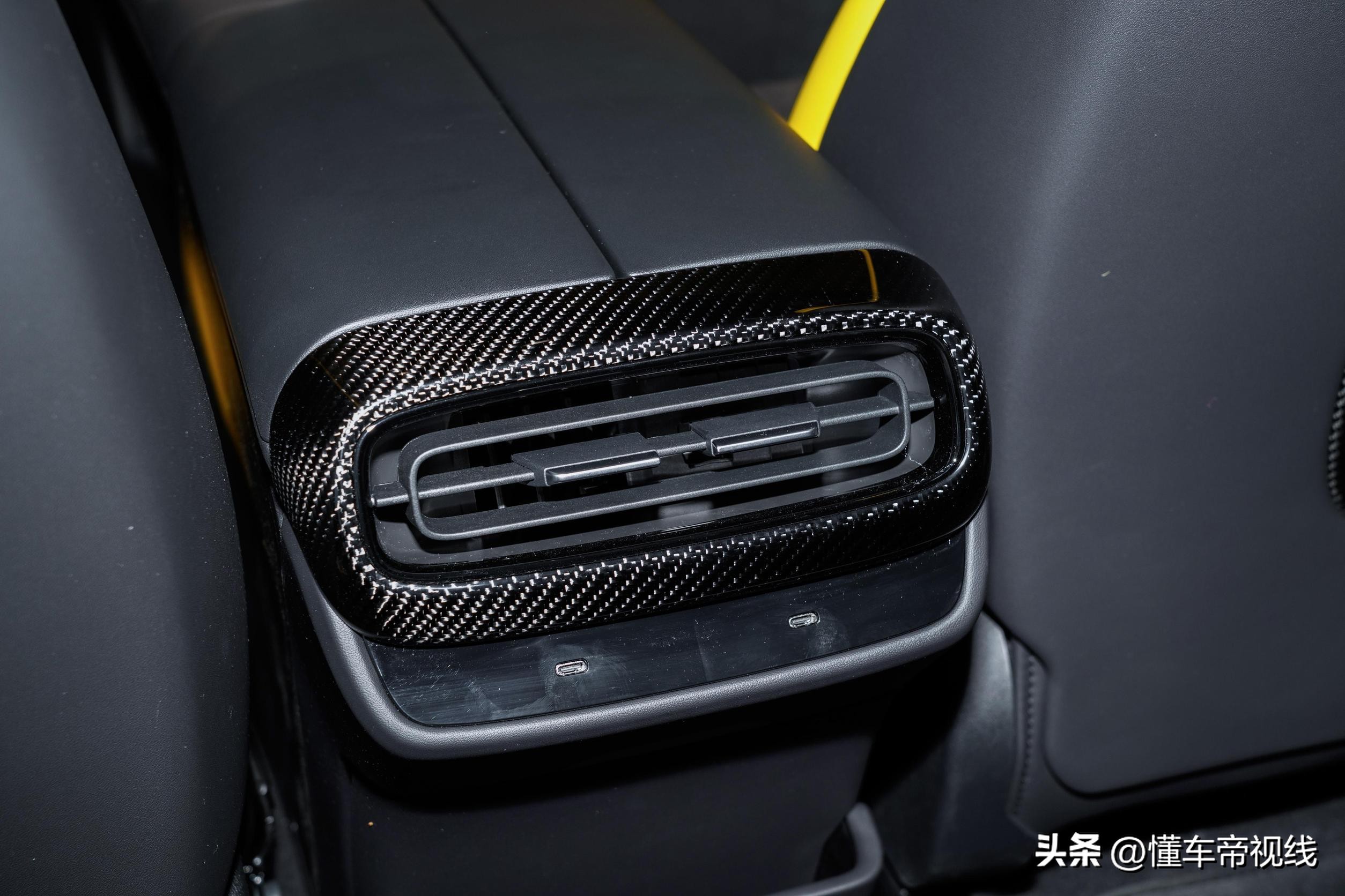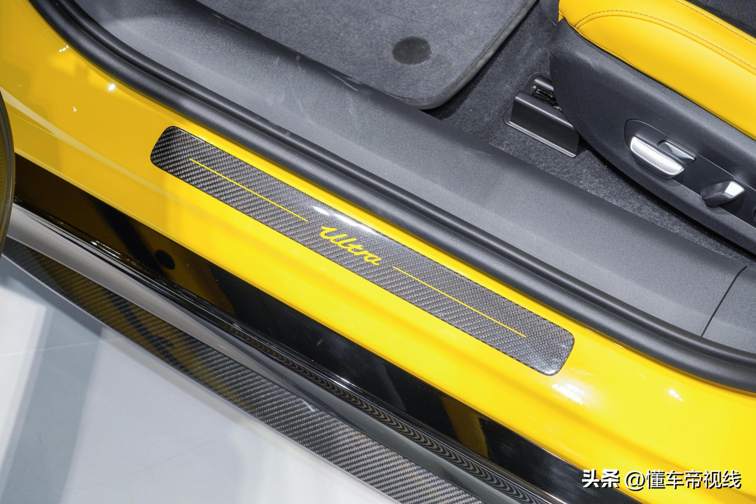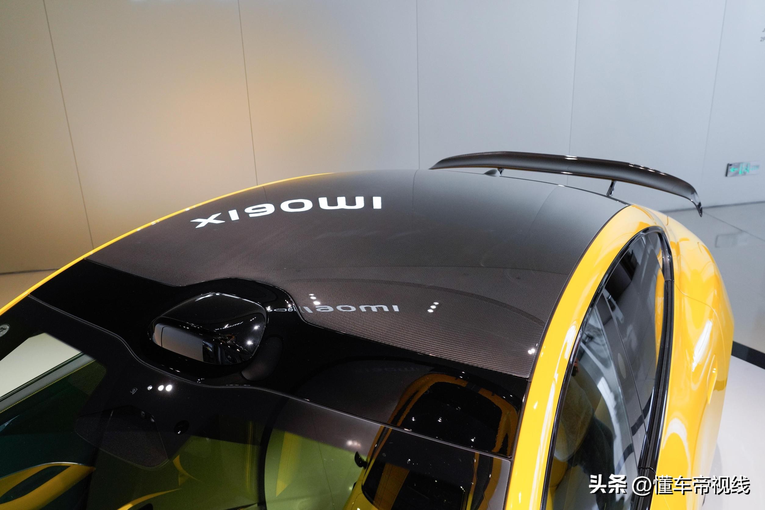 车身侧面,小米SU7 Ultra在车门下边缘提供有带Ultra标识的银色拉花,并提供有碳纤维车顶、碳纤维侧裙装饰件、碳纤维外后视镜壳等碳纤维部件。