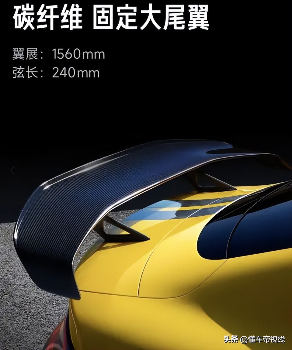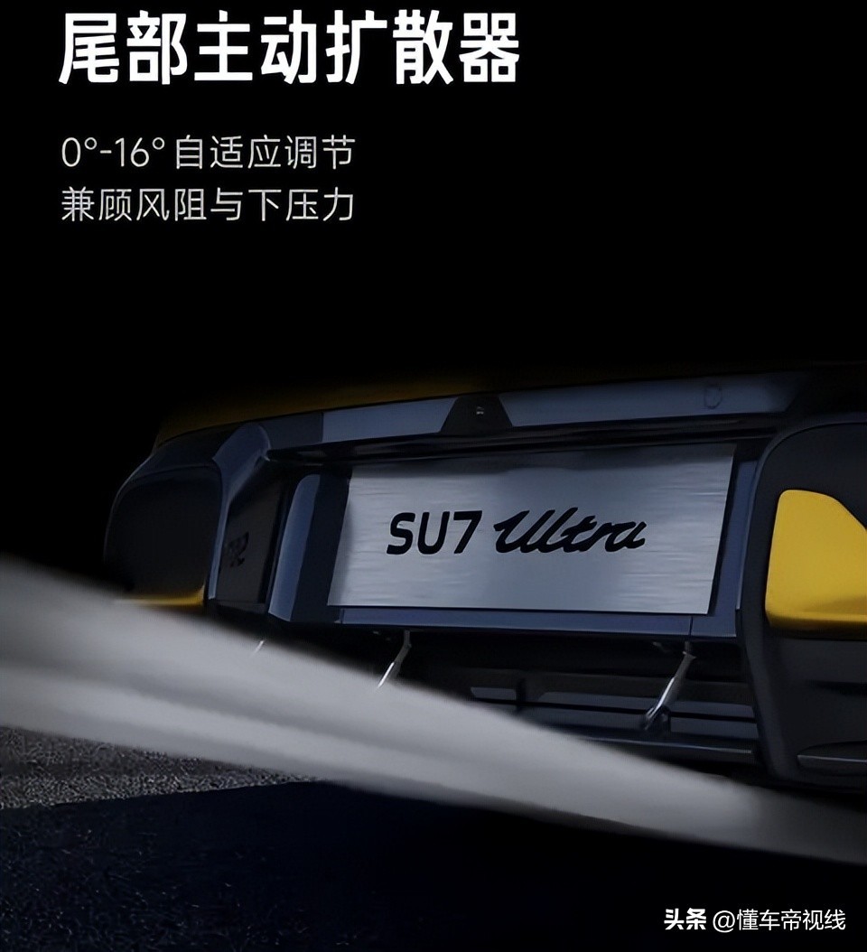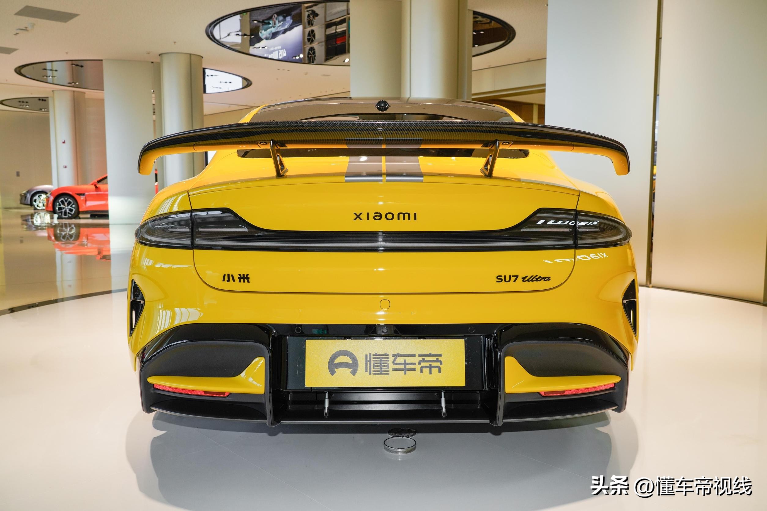 车尾部分,小米SU7 Ultra提供碳纤维固定式大扰流板,并对尾部标识进行黑化处理,右下角的“SU7 Ultra”标识表明身份信息。此外,该车还配备有新造型的后包围,配合底部主动扩散器,整体展现出较强的战斗感。