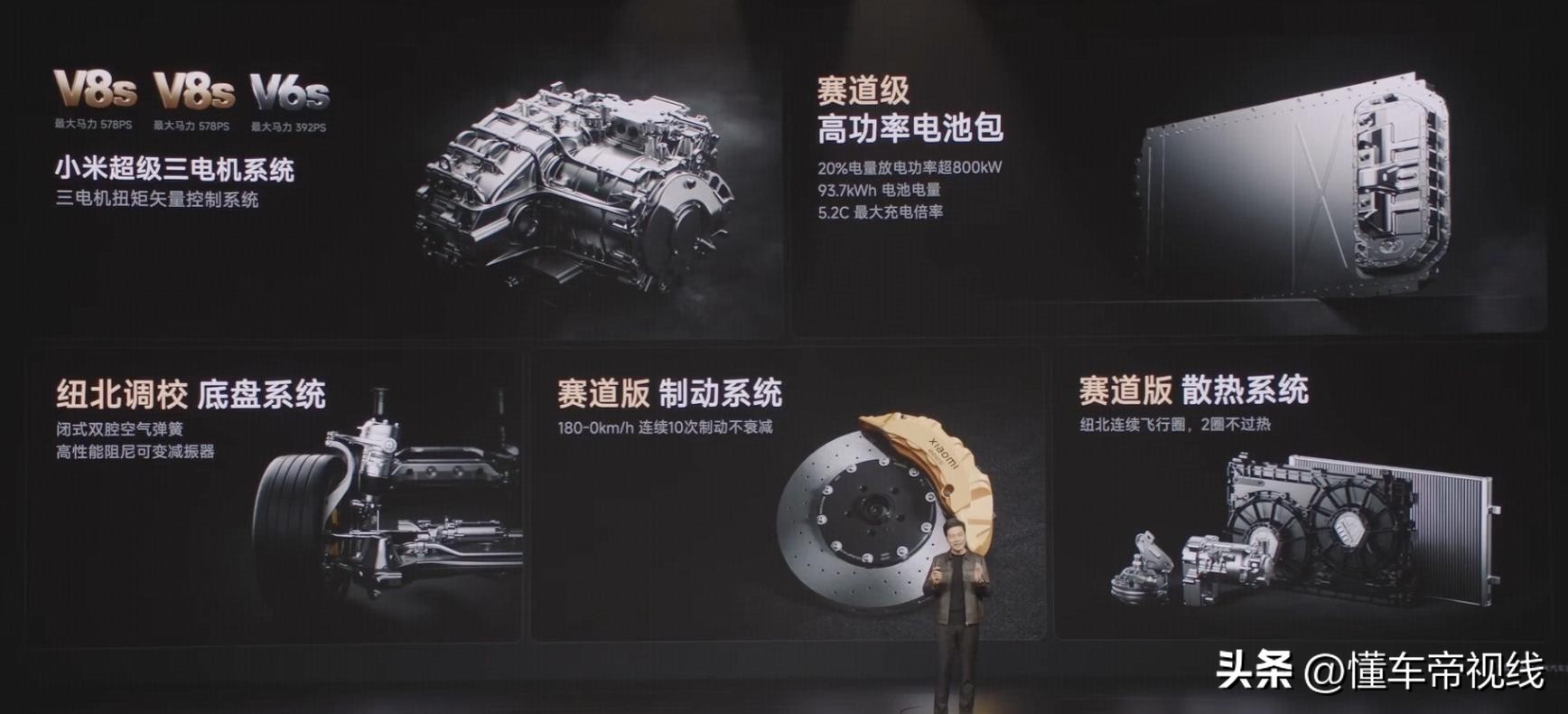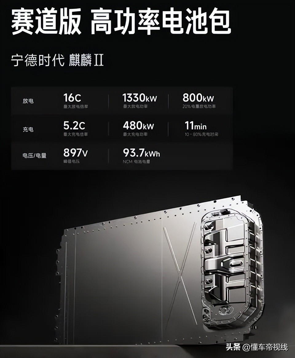 动力部分,小米SU7 Ultra搭载两台V8s电机以及一台V6s电机,其中V8s电机最大功率为578马力,V6s电机最大功率为392马力,系统综合最大功率为1548马力。0-100公里/小时加速时间为1.98秒,最高车速350公里/小时,配备有宁德时代麒麟Ⅱ赛道专用高功率电池包,支持最高5.2C充电倍率,峰值电压为897伏。据悉,新车搭载容量为93.7千瓦时的三元锂电池组,标准版车型CLTC续航里程为630公里。