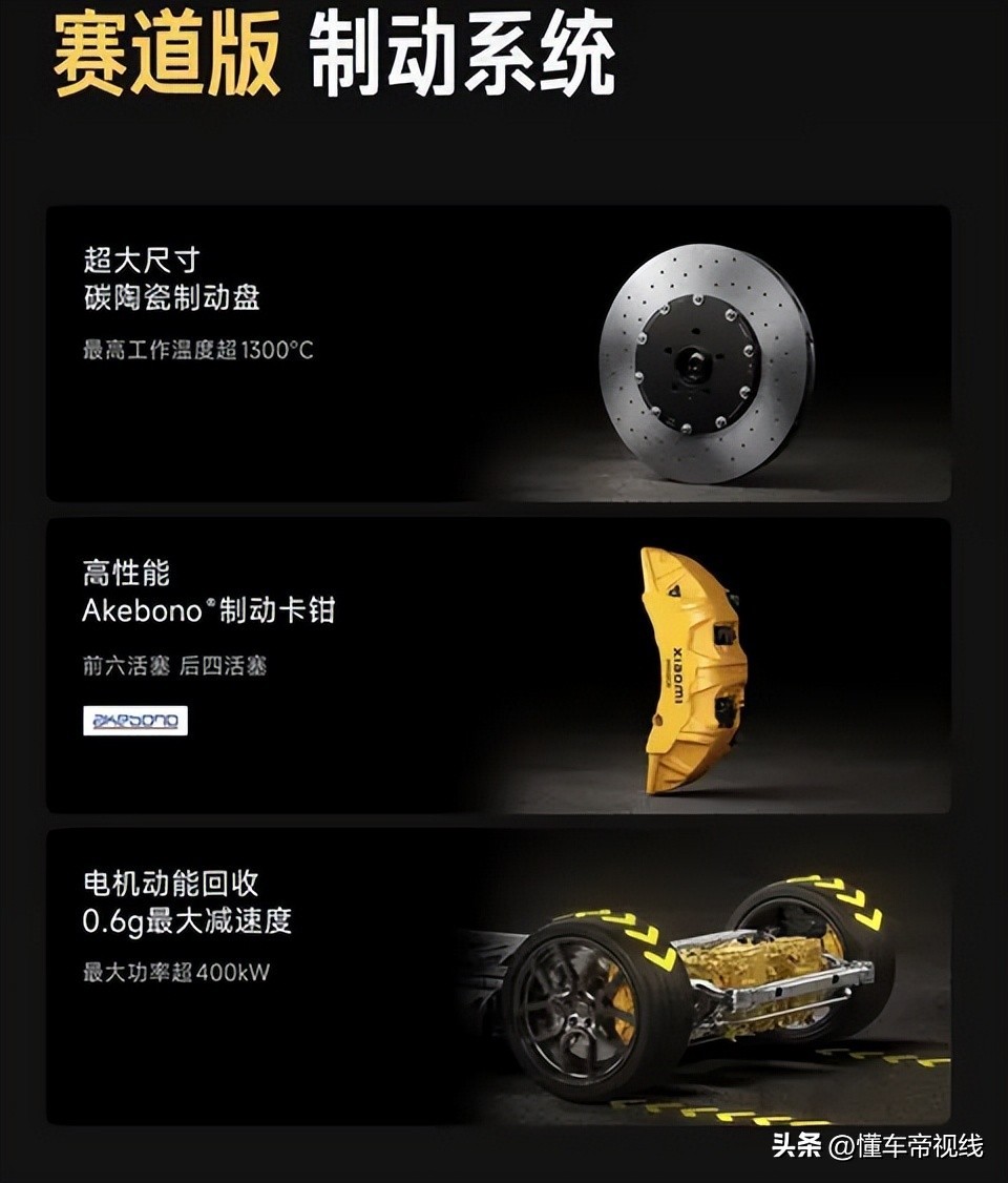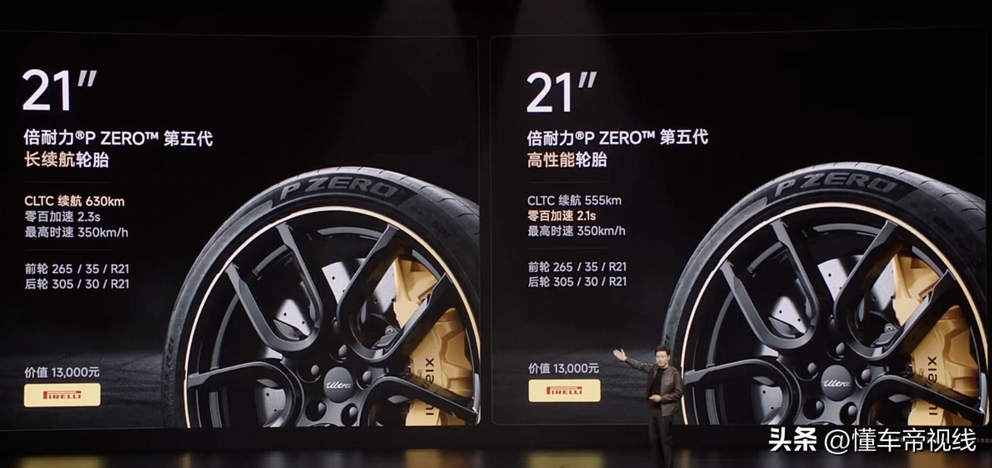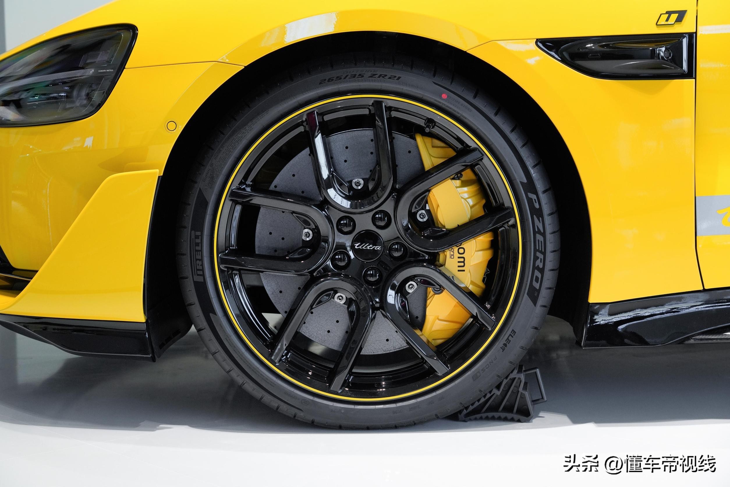 小米SU7 Ultra提供21英寸黑色轮辋,匹配倍耐力P ZERO 5轮胎,前轮胎规格为265/35 R21,后轮胎规格为305/30 R21。同时,该车标配有碳陶瓷制动盘,前制动盘直径为430毫米,后制动盘直径为410毫米,并配备前六活塞/后四活塞Akebono黄色制动卡钳。此外,小米SU7 Ultra提供5种风格轮辋可选。