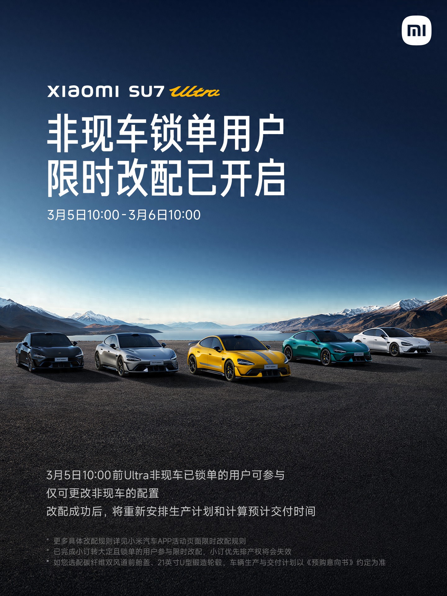 [懂车帝原创 产品] 日前,我们从小米汽车官方获悉,3月5日10:00-3月6日10:00,针对小米SU7 Ultra非现车锁单用户开启限时改配。小米SU7 Ultra于今年2月27日上市,标准版指导价格为52.99万元。