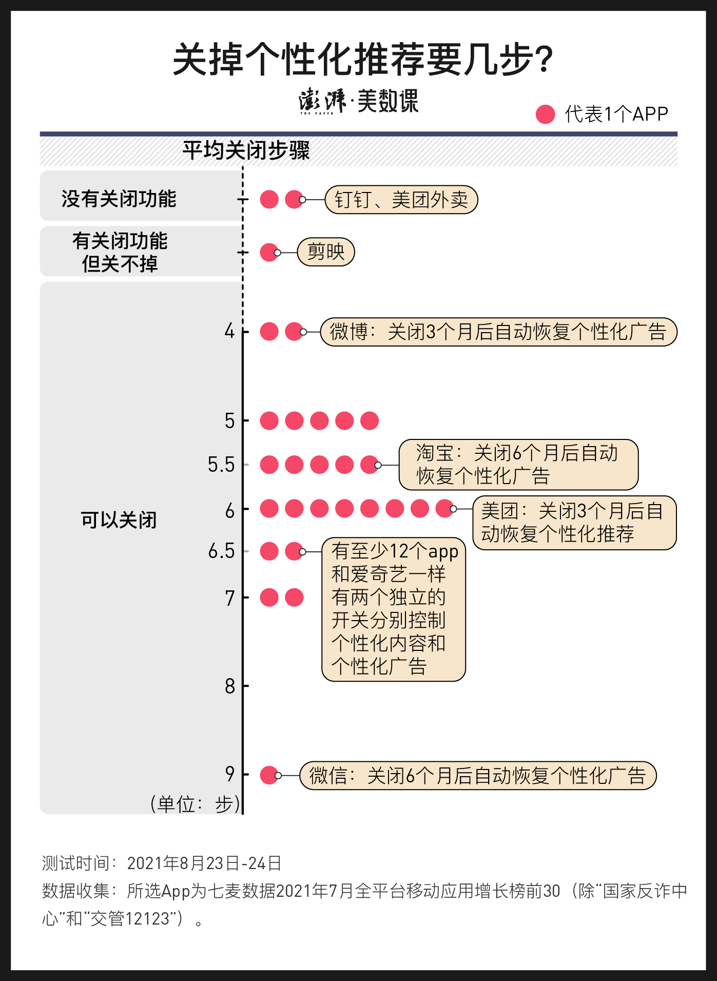 虽然《个保法》还没有正式生效,但28个App中的26个都已设置了个性化推荐功能的开关。不过,行使拒绝权依然不那么容易。打开App后,平均需要点击6次才能关掉个性化推荐,在微信中甚至要点击9次。