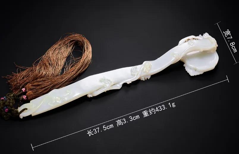 详情:器以白玉为材,莹润致密,质色清润通透,凝脂含光,包浆醇和,造型别致。此件如意整料精琢而成,扁体长曲柄,其首作云叶式以剔地阳工艺琢仙桃、蝙蝠及花卉,仙桃果实饱满,蝙蝠展翼欲飞,花朵盛开,脉络清晰,此题材寓意吉祥有“福寿双全”之意。如意柄上以浮雕及镂雕相结合琢花卉缠枝,花叶翻卷自如,绽放舒展,脱俗清丽,枝干挺拔,起伏有致。此件如意之器型、纹样、琢工皆具鲜明的时代风格,是颇为标准的宫廷琢玉,兼之尺寸硕大,寓意吉祥,实为难得佳器。据有关资料记载,如意远在东汉时就已有之,在清朝时,已成为宫廷的珍宝之一,造型多变。最初的“如意”是由古代的笏和搔杖演变而来,当时人们用它来搔手顾不到的痒处,可如人之意,故名“如意”。有清一代玉料充足,而如此不计工料的大件如意,也是皇室才有的陈设。