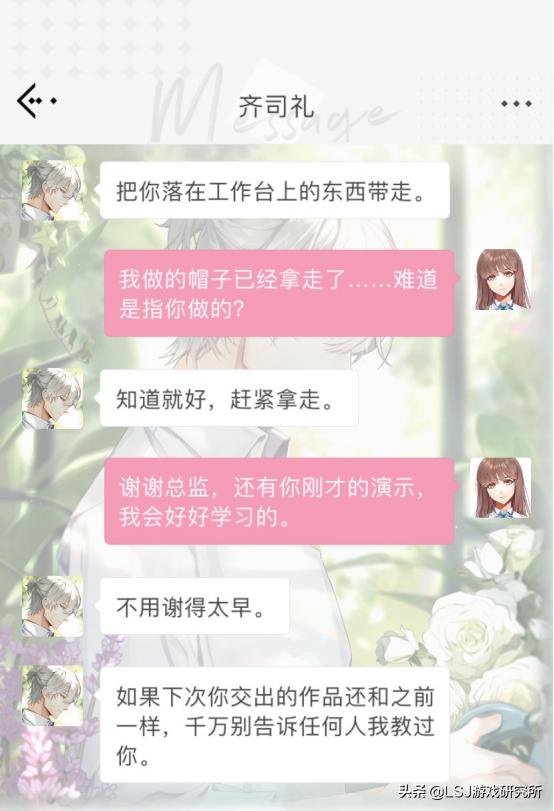 就以《光与夜之恋》为例,第一章男主萧逸出场之后,他会主动加玩家的微信,并和玩家聊天,当主角的设计的帽子被齐司礼批评得体无完肤之后,他会发短信安慰玩家说自己觉得玩家设计的帽子很好看,当玩家感谢他的安慰时,他又会很符合人设地傲娇地回复一句他没在安慰玩家,而齐司礼则会发短信鞭策玩家希望自己能看到玩家的进步。
