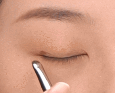 选择一把扁头眼影刷,蘸取少量浅色眼影,从睫毛根部慢慢地往上晕染,让眼影形成睫毛根部深、边缘颜色浅的渐变。