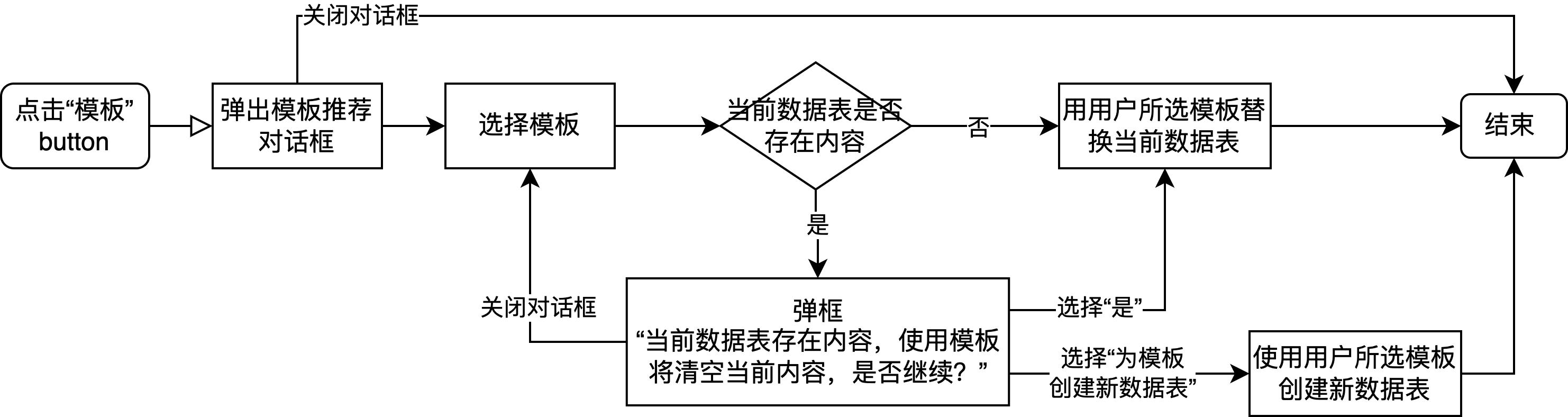 模板的推荐和引导界面仅在新建多维表格和数据表后出现,整个操作页面没有跳转到“使用模板”功能的入口,对于选择了新建空白数据表但又发现界面和功能陌生产生使用模板需求的用户来说,需要重新新建一个多维表格以使用模板,用户后悔成本过高,建议在标题栏或者侧边栏新增“模板库”button,功能流程如下图:
