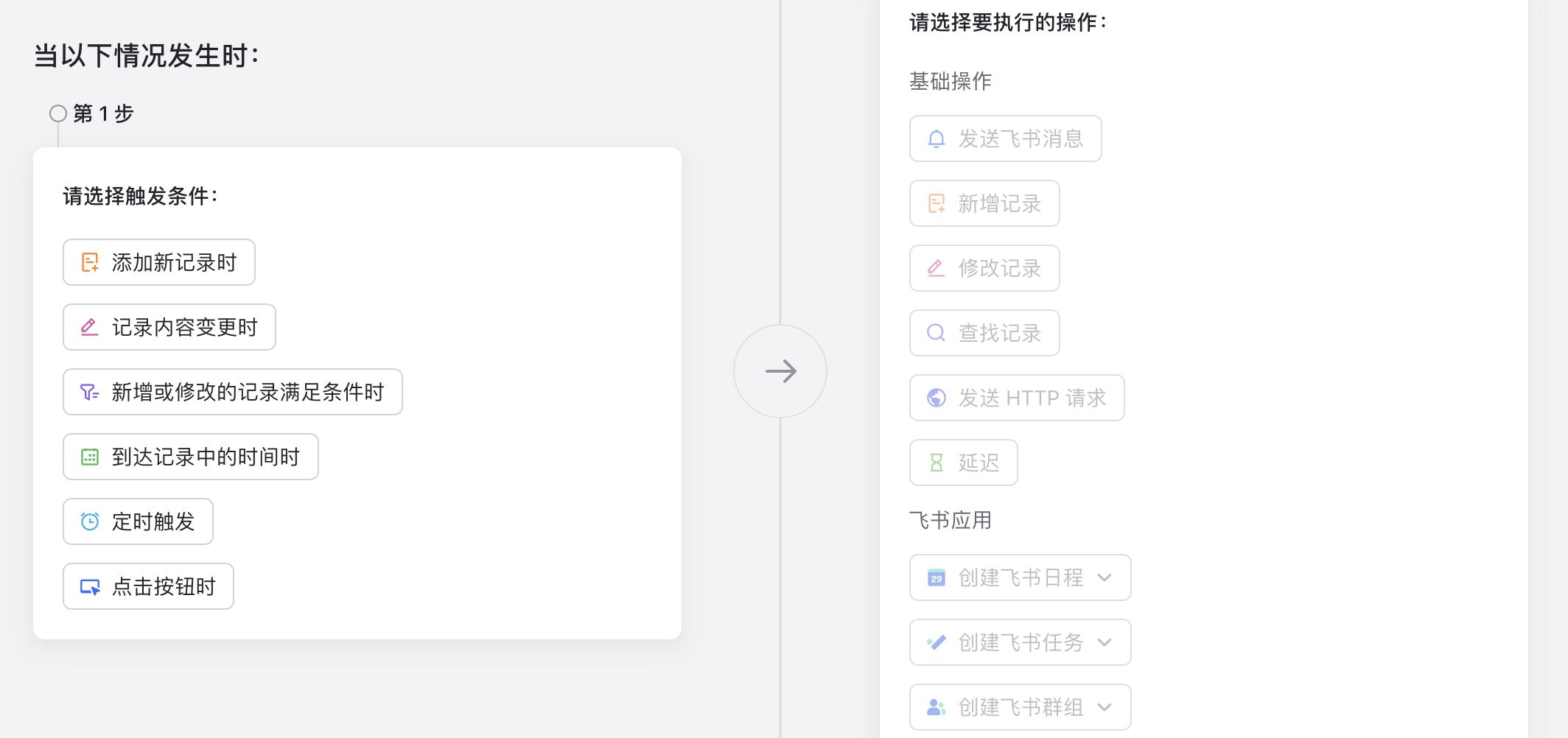 多维表格设置了“自动化”集成了数据监测、条件判定、执行指令功能,解决了这一难题。任何流程都可以看作是触发条件+要执行的操作,自动化利用了这一逻辑,设计了6种触发条件和9种操作指令(其中一种为多指令时调整指令间间隔时间),都可以根据实际需求自定义调整条件。条件和指令都可以设置多个,多条件关系为“同时满足”,多指令间关系为依次有序执行,让表格“自己动起来”。