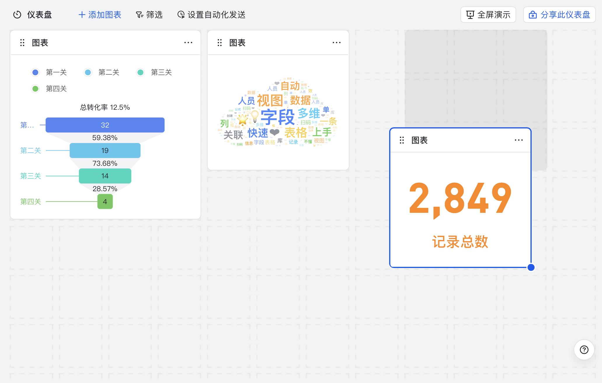 数据经历收集、清洗、整理后,接下来就是进行结论呈现和汇报展示,图表是最佳选择。多维表格丰富了单记录内容的展示方式,但不能插入图表,相比传统表格却缺失了汇总分析呈现的功能,仪表盘补全了这个空白。
