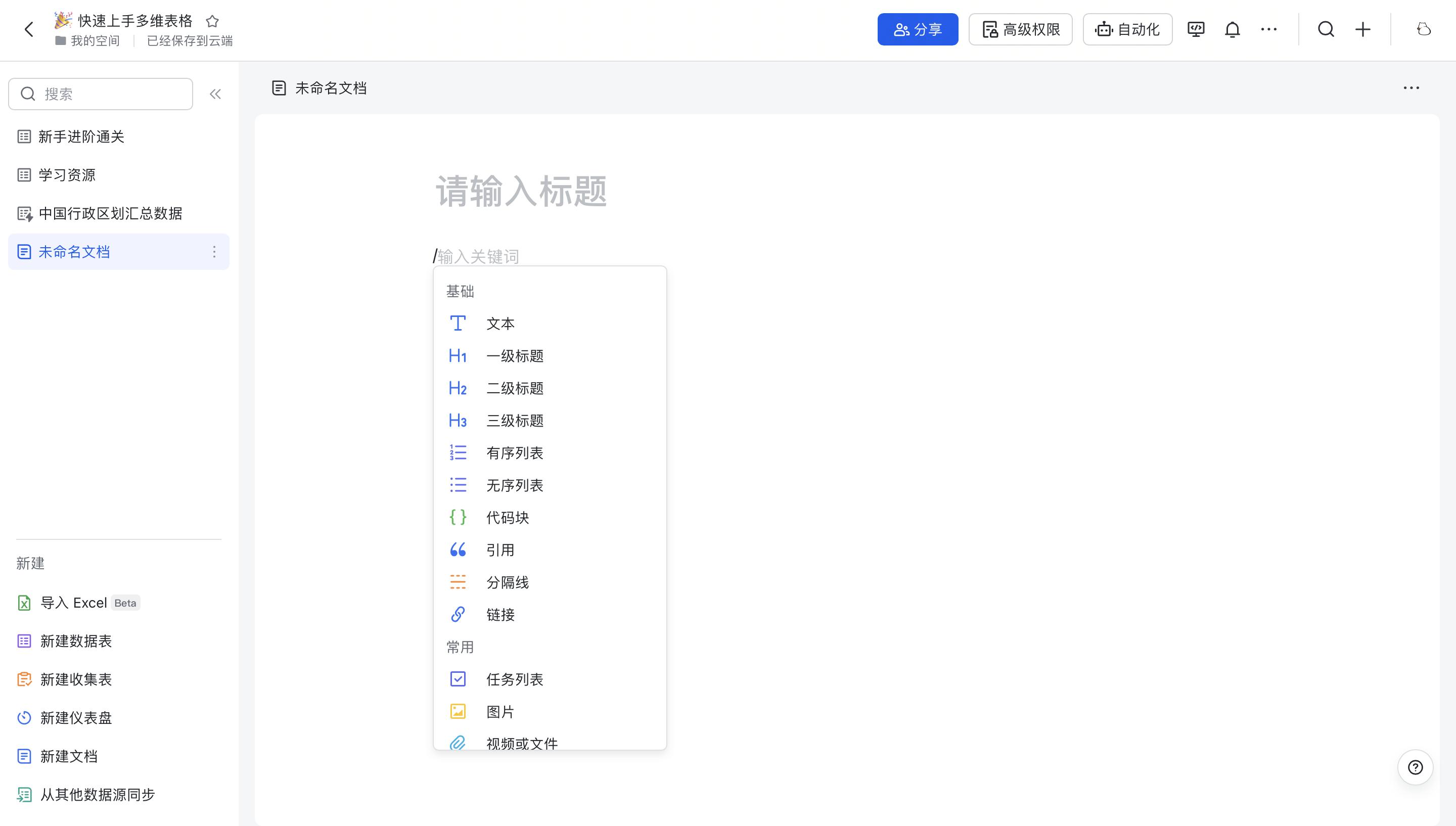 此功能并不是在当前表格中创建文档,而是创建文档的快捷方式,在“数据表”级别创建页面以展示文档,文档位置实际在用户云盘的默认创建路径,且权限与多维表格独立设置。此功能适用于需要为多维表格添加说明、报告的场景,使用频率不一定高,但属于魅力型需求。但使用时发现,仅能在多维表格内新建文档,云盘已有的文档无法添加至多维表格内显示,添加文档的途径略显单一。