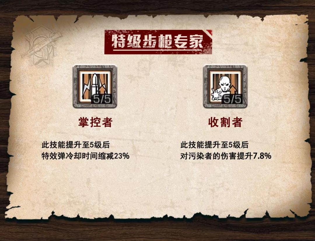 特级步枪专家:掌控者满级可获得23%特效弹的冷却缩减,以一把五星蛛毒为例,点满掌控者的冷却时间为9.3秒,非步枪兵职业看到的是12.1秒,收割者满级可以提升7.8%对污染者的伤害,打本必备技能没错了。