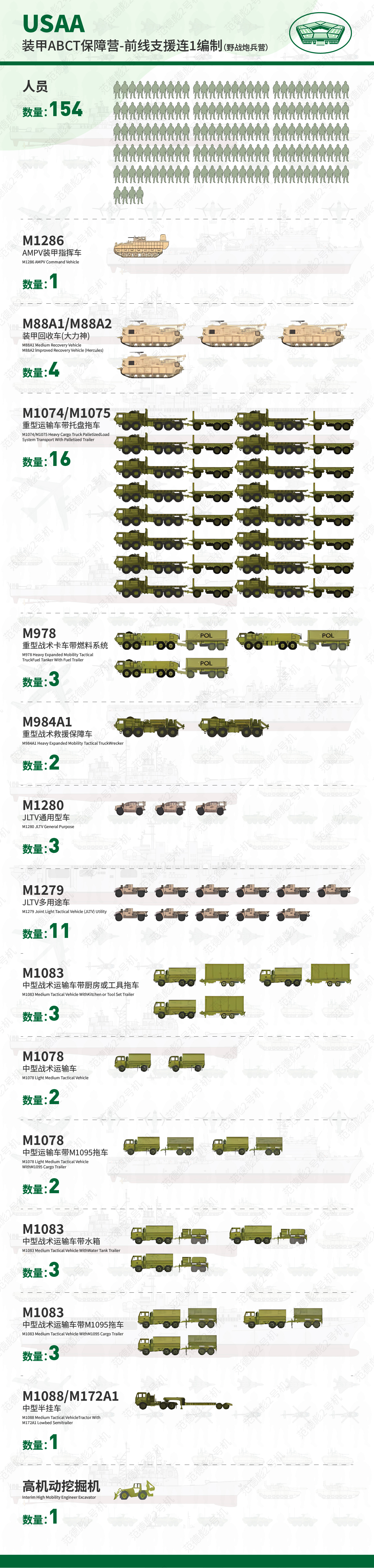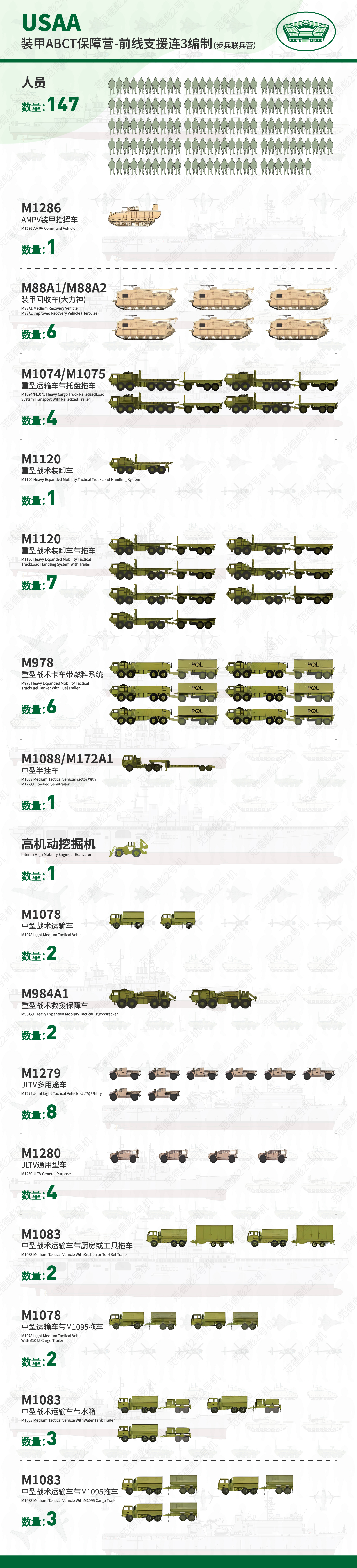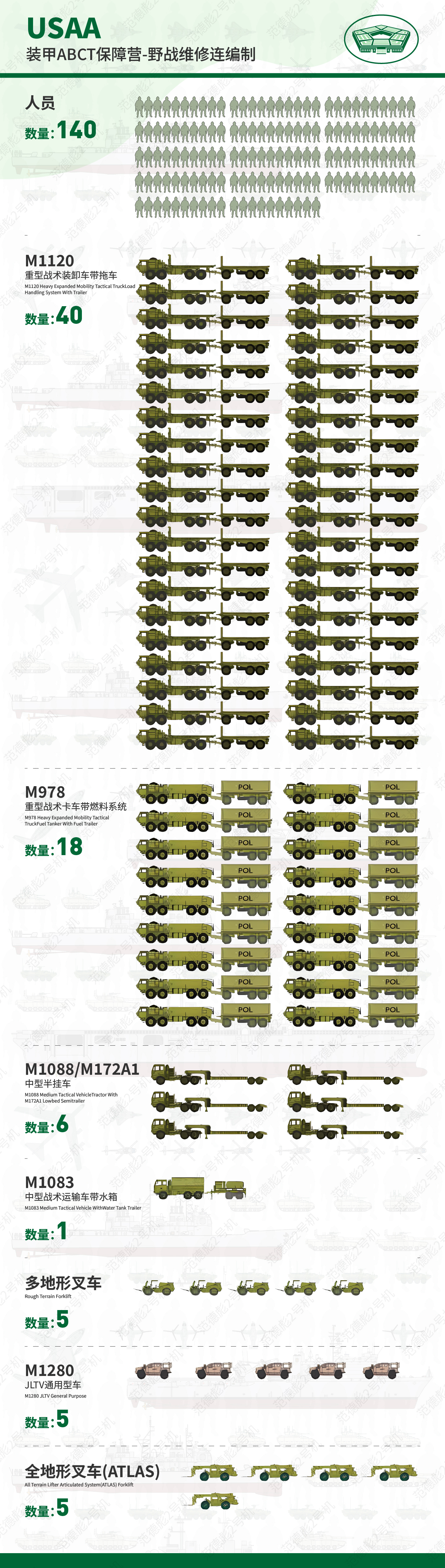 所谓兵马未动、粮草先行,装甲ABCT的旅属支援保障营人数占比超过整旅的四分之一;车辆装备也是所有旅属单位里最多的。管中窥豹,管中窥豹,本期飙某人以旅属保障营的详解来看看现代重装合成旅对后勤保障的要求有多高。