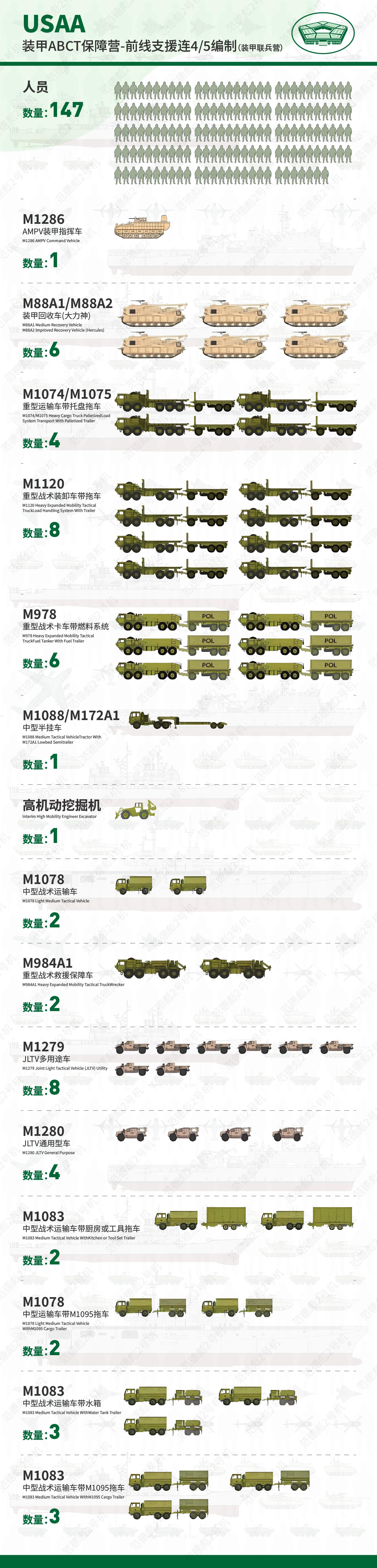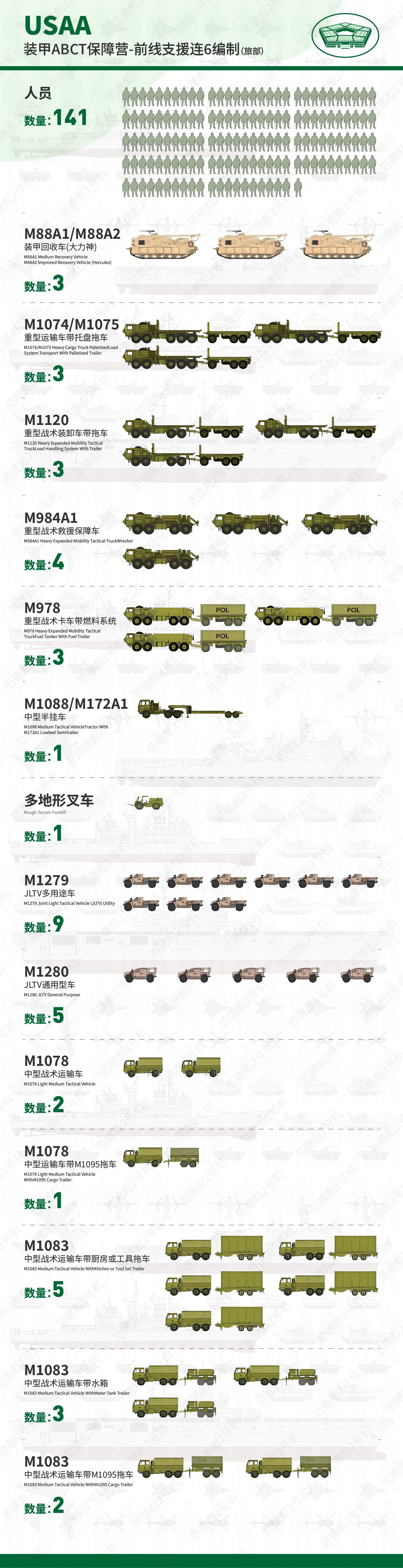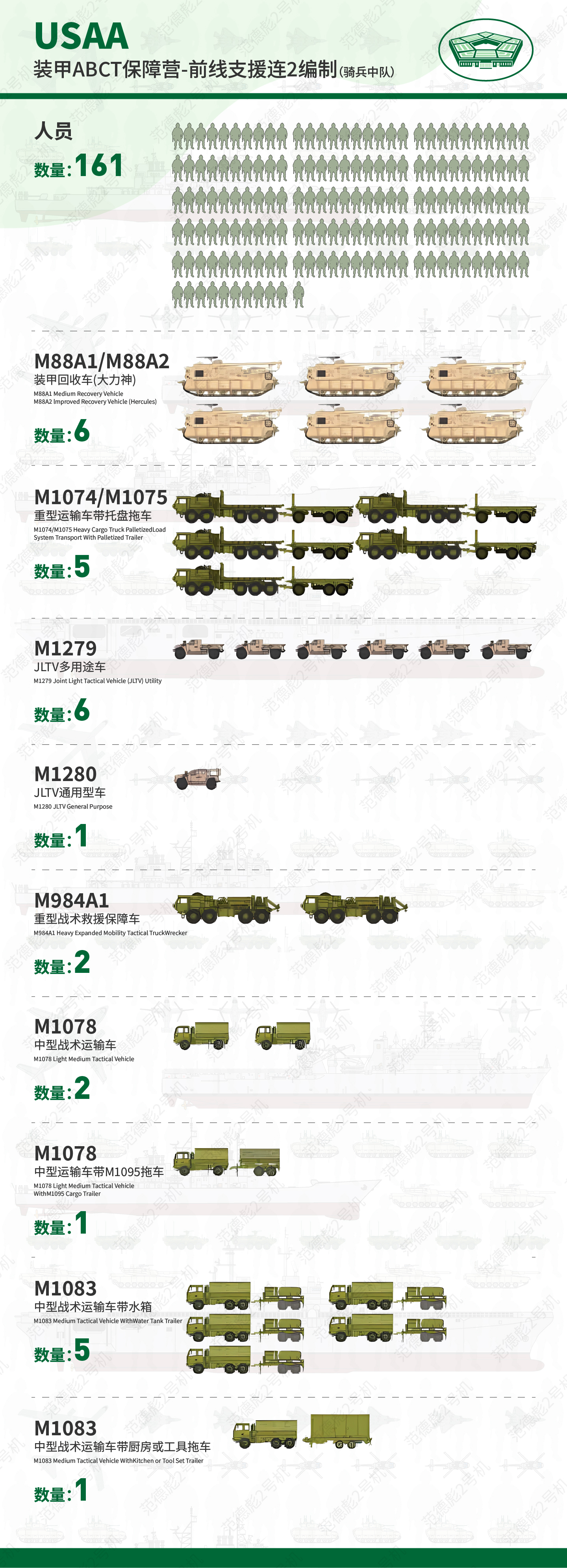 所谓兵马未动、粮草先行,装甲ABCT的旅属支援保障营人数占比超过整旅的四分之一;车辆装备也是所有旅属单位里最多的。管中窥豹,管中窥豹,本期飙某人以旅属保障营的详解来看看现代重装合成旅对后勤保障的要求有多高。