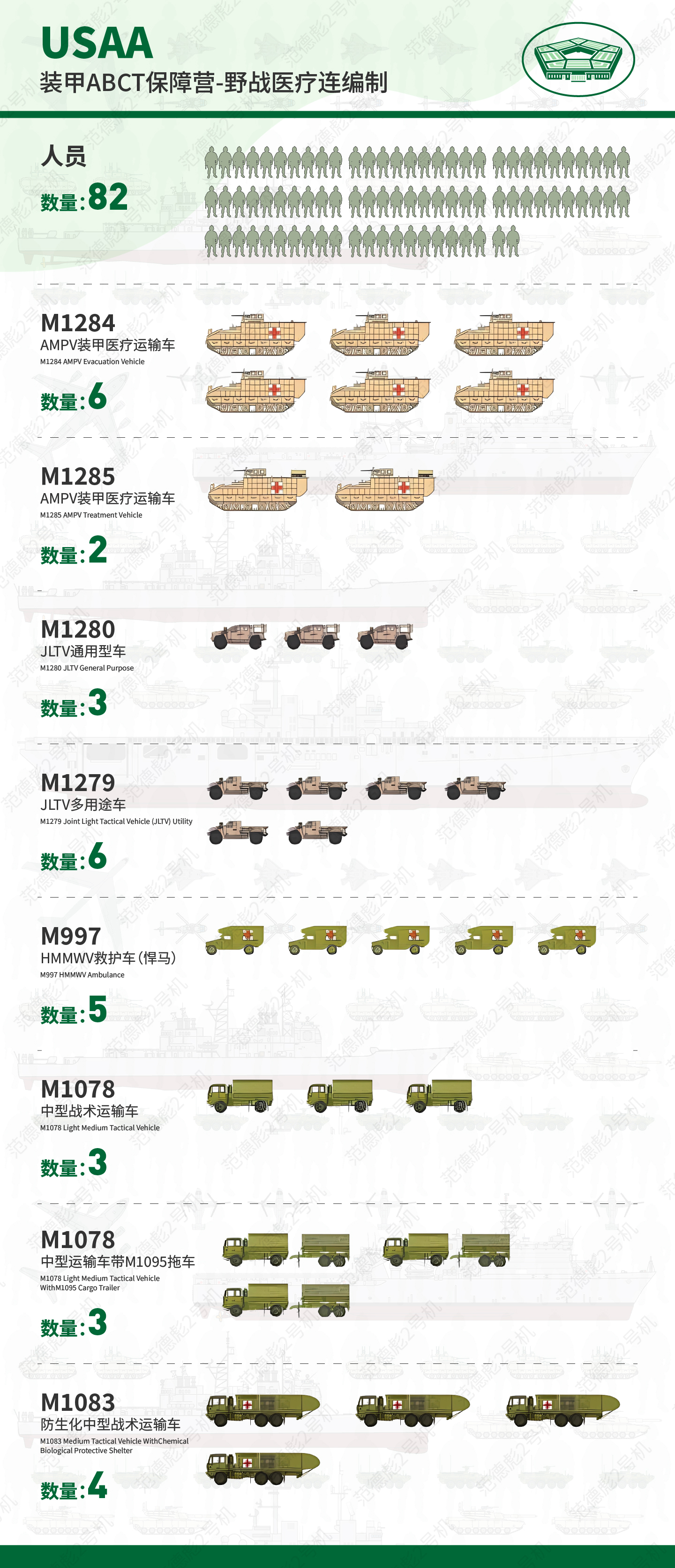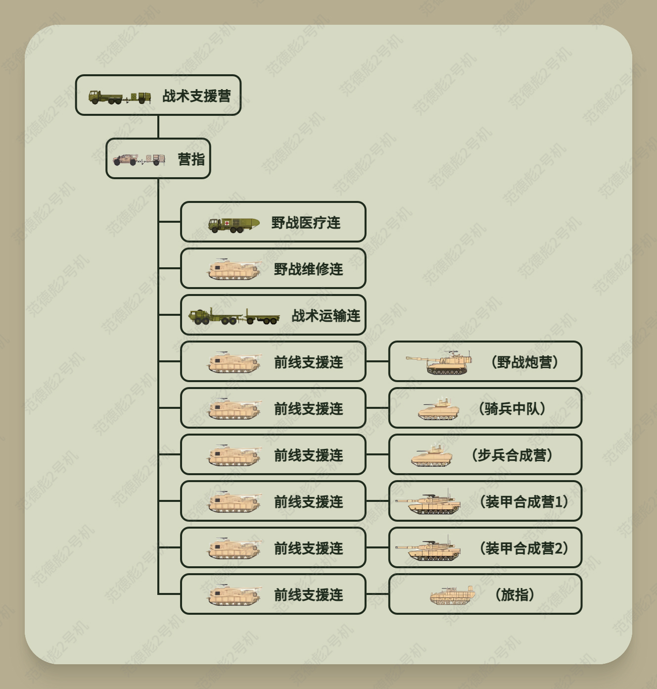 架构上没什么好说的,营级指挥、野战医疗、运输、维修都是后勤保障的标配,比较有特色是旅属作战单位的保障连是由保障营下设单独的保障连,而不是直接设在作战单位里。