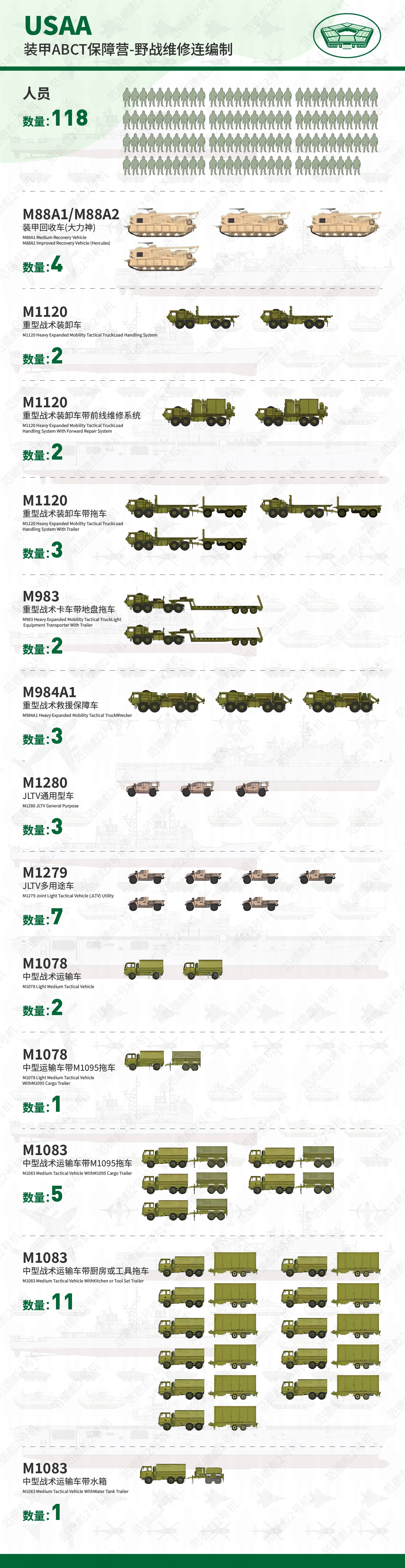 整体看,旅属支援保障营人员有1,174人,占整个装甲BCT人员编制的四分之一还要多。车辆装备数量比起所有作战单位加起来也不逞多让,这是前期就已经多次提及过的,装甲ABCT强大的作战能力是建立在恐怖的后勤保障难度上。