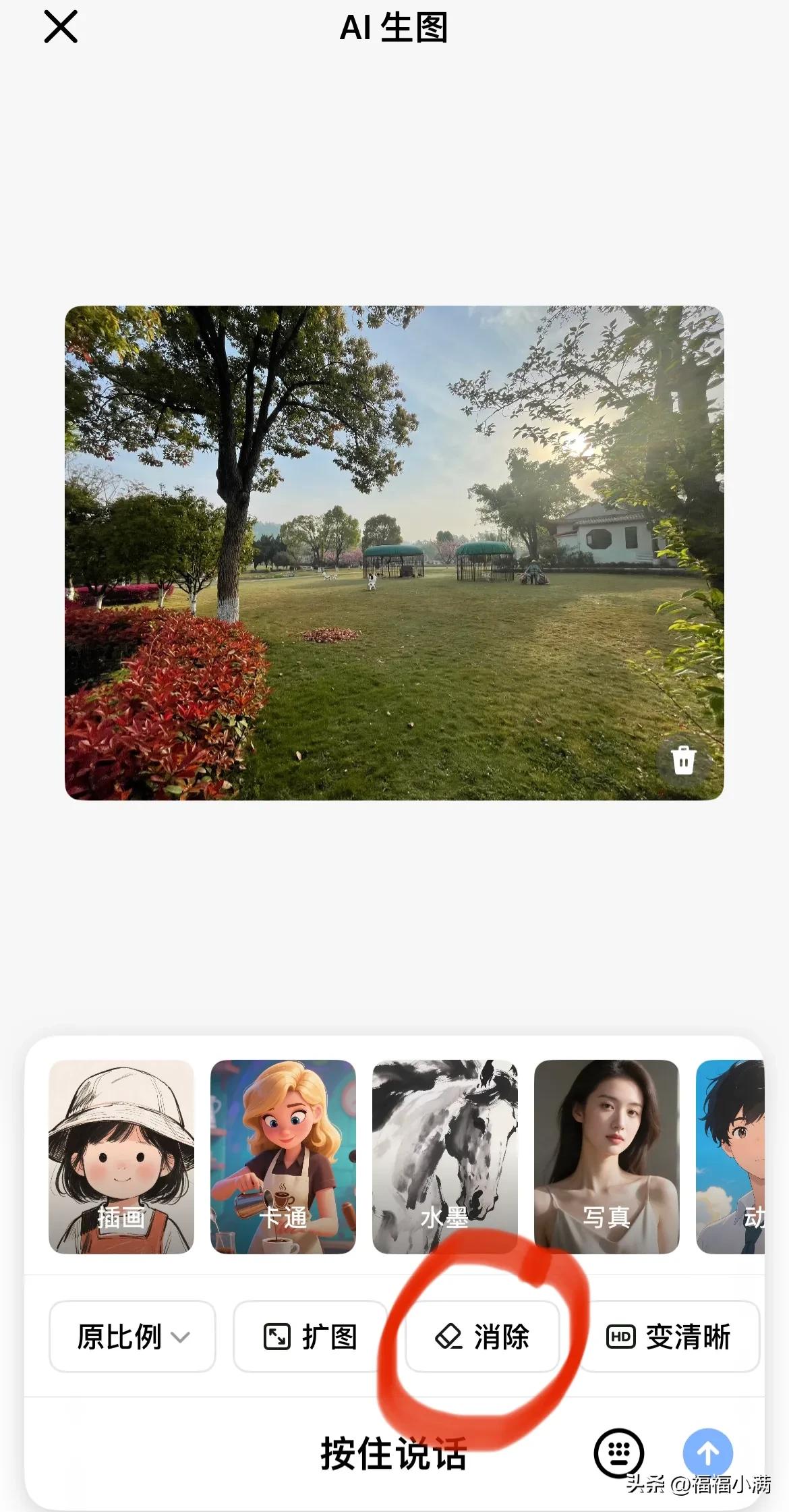 豆包的AI生图功能很强大,消除只是她的一个小小功能,还有扩图,变清晰等,
