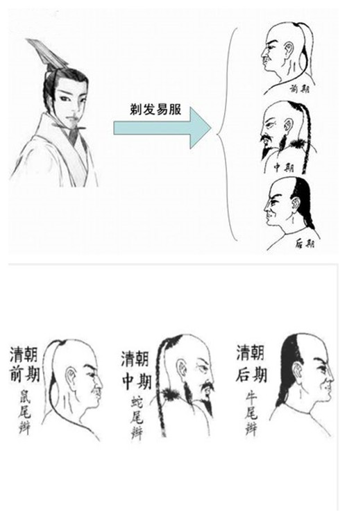 随着汉人统治朝代的终结,中国人迎来了史上最耻辱的“剃发蓄辫”时代。女真人统治下的满清政权,为了维护自己的统治地位,开始强制推行剃发蓄辫制度,强迫汉人跟随满族人留“弃四周,留中国”的发式,甚至发布了“臣僚不得论奏剃发,否则杀无赦”的法令。极其可笑的是,“剃发不如式者亦斩”,即剃得太少或留得太多都是杀头的大罪。先不说,汉人对头发的崇敬和珍惜,单单这么一条吹毛求疵的条例就足够引起民众反感和抗拒。汉族人的发型有多美,满清人的发型就有多丑,不信你读读这几个发型名称:鼠尾辫、蛇尾辫、牛尾辫。
