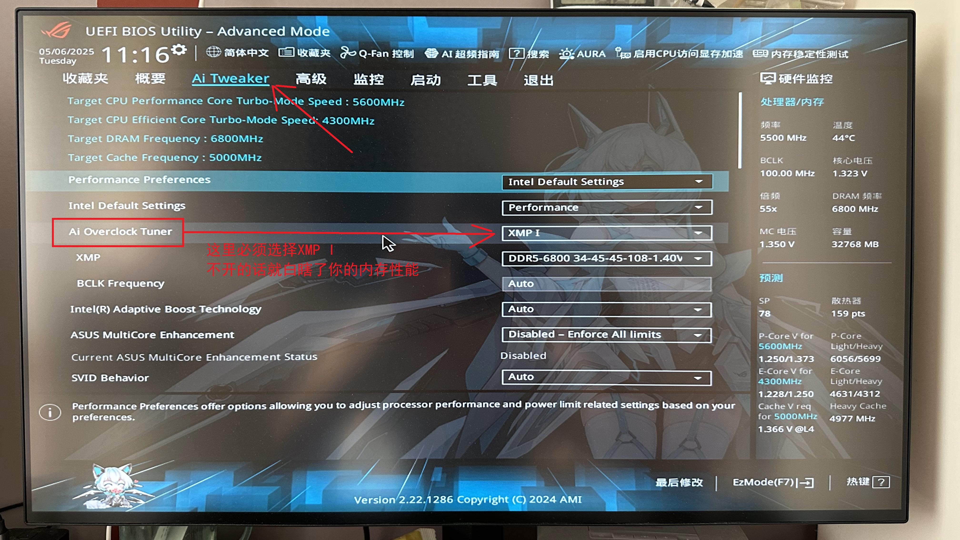 1、点击“Ai Tweaker”找到【Ai Overclock Tuner】把这个设置改为【XMP I】下面的“XMP”就会显示出来你的内存型号频率(例如:DDR5-6800 34-45-45-108-1.4V)