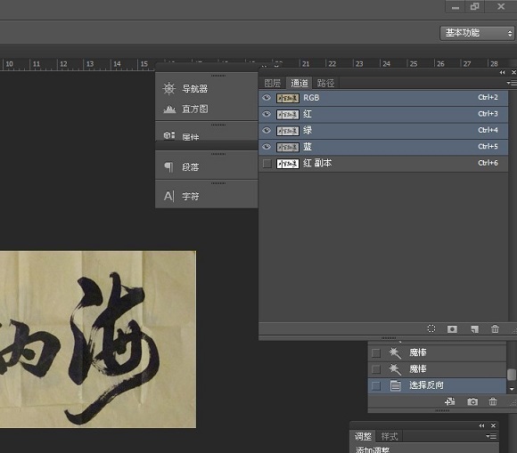 6.用选择工具选取所有白色方块,按ctrl+shift+I反选,之后再选择通道红绿蓝,如下图所示: