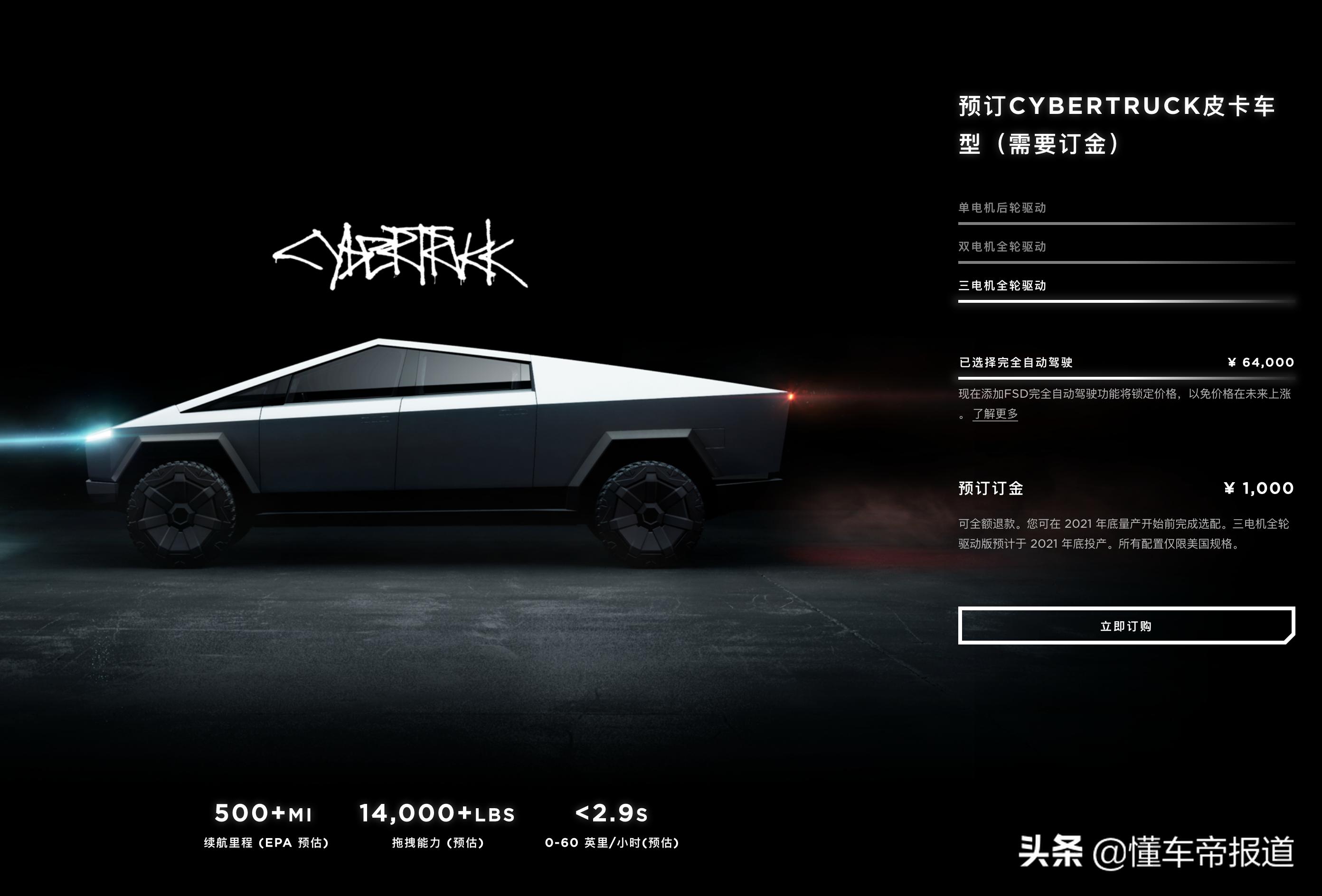 特斯拉中国官网显示,Cybertruck目前已接受预订,订金为1000元(可全额退款)。它提供单电机后轮驱动、双电机全轮驱动和三电机全轮驱动共计3款车型,根据配置不同,续航、拖拽能力和加速能力依次递增,续航里程分为EPA预估里程402公里、483公里和805公里三个版本。并且,双电机、三电机全轮驱动车型均为2021年底开始投产,售价最便宜的单电机后驱车型将在2022年底才开始投产,所有车系前期的配置均采用美国规格。