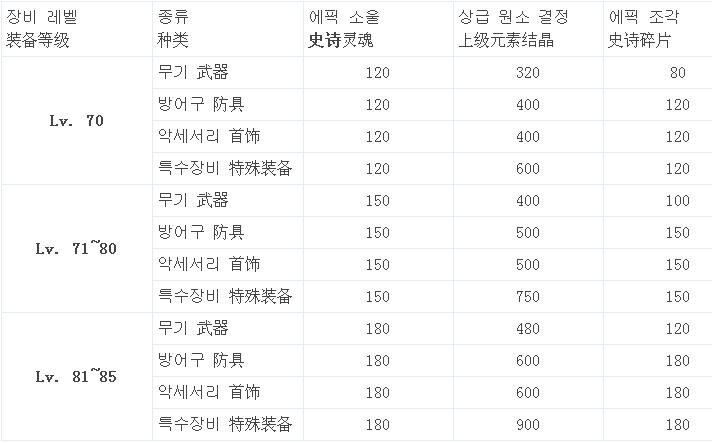 装备跨越系统需要材料(70~85等级史诗装备基准)