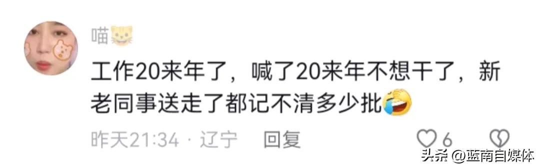8、@喵:工作20来年了,喊了20来年不想干了,新老同事送走了都记不清多少批