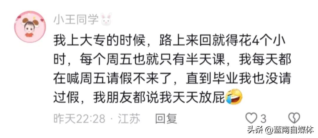 6、@小王同学:我上大专的时候,路上来回就得花4个小时,每个周五也就只有半天课,我每天都在喊周五请假不来了,直到毕业我也没请过假,我朋友都说我天天放屁