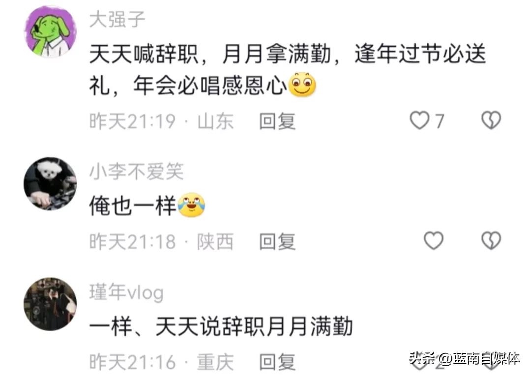 9、@大强子:天天喊辞职,月月拿满勤,逢年过节必送礼,年会必唱感恩心