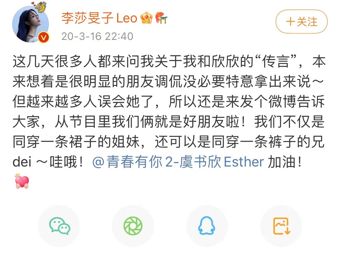 眼看着虞书欣的口碑一路下跌,李莎旻子也赶忙出来解释,她表示自己和她在《一年级》中就是好朋友,已经是可以穿同一条裙子的关系了。