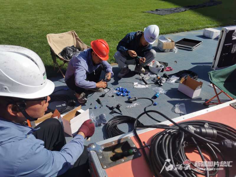 8月17日,乌鲁木齐奥体中心,工作人员正在为主舞台设备安装配件。