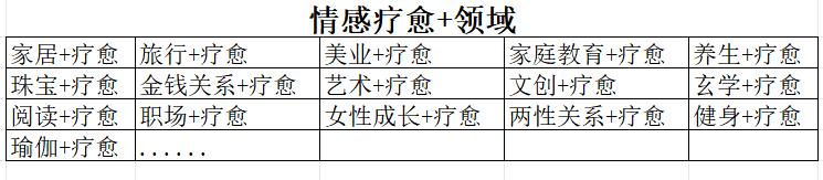 情感疗愈是一项小众生意,却有着大众需求。不同的场景或领域也会有各自的需求点,通过情感疗愈+领域的形式能开拓多样化的内容形式,也会扩大流量渠道,比如:
