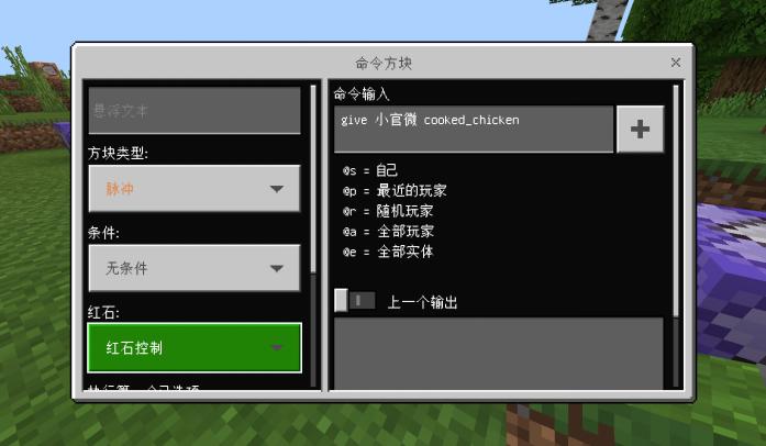 放置一个在地上打开并输入testfor @e[type=item,name="生鸡肉"],方块类型选择循环,条件设置成无条件,红石选择保持开启,这条指令的意思是检测周围是否有掉落的鸡肉,有则输出红石信号