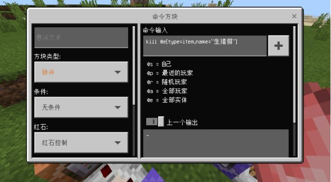 然后在打开最后一个命令方块并输入kill @e[type=item,name="生鸡肉"]