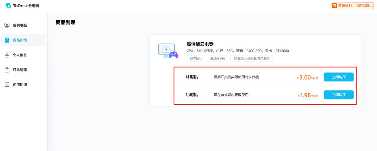 ToDesk云电脑的使用套餐提供计时机和包时机的两种方式。如果是初次尝试,使用时间不确定,推荐选择计时机,开机即启动,关机立即暂停时长消耗,下次有需求时再打开即可继续使用。