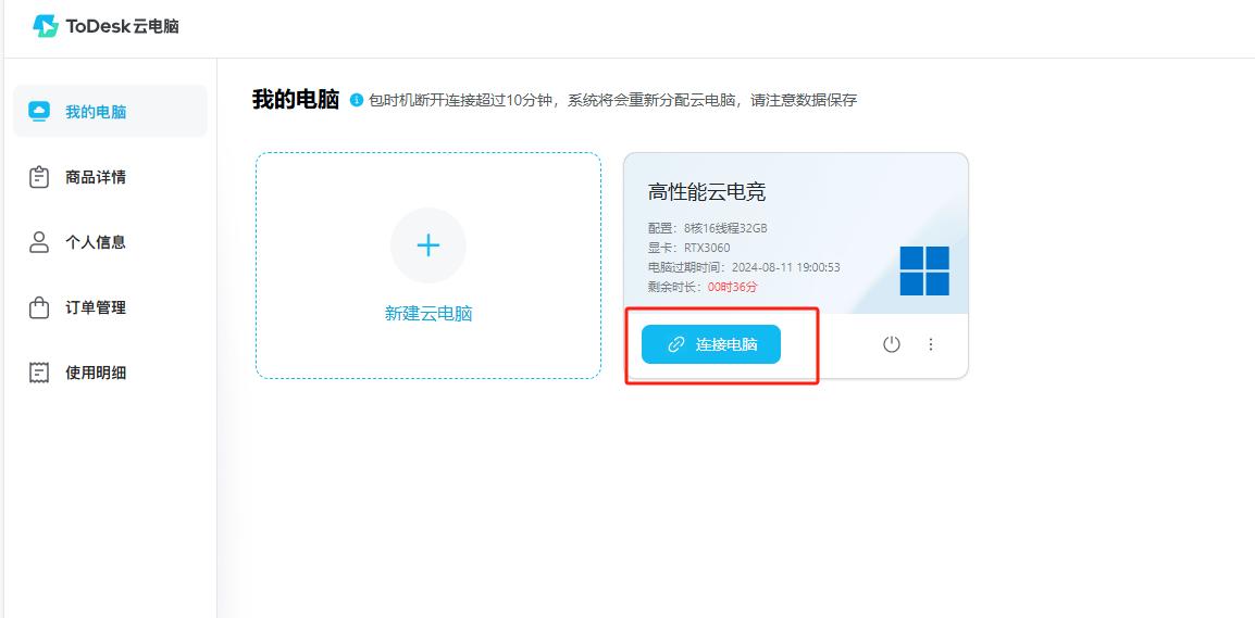 第四步:点击【我的电脑】可以看到刚刚购买好的云电脑,点击【连接电脑】即可进入云电脑主页面