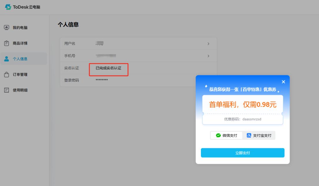 第二步:安装完成打开云电脑软件,注册登录账号并完成个人实名制认证,获得首单福利券