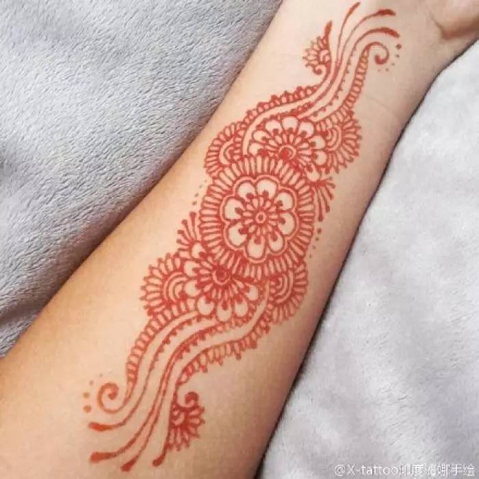 海娜纹身起源于印度,是一种可以短时间保存的人体绘画。所以,严格地说,海娜同纹身还不一样,因为它不像后者是刺上去的,海娜只是绘在皮肤上的装饰图案,通常它可以存在几天或者几个星期之久。
