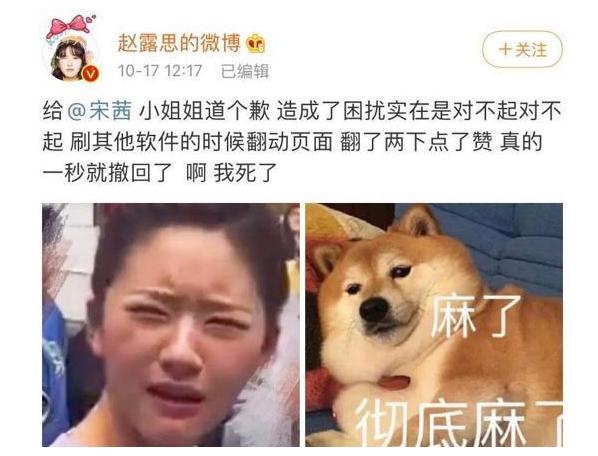 不小心手滑点赞内涵宋茜金鹰女神的造型,还好立马发文道歉。