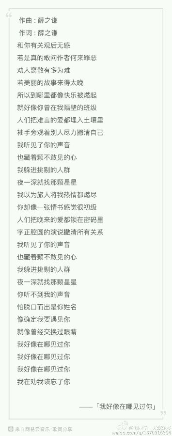 薛之谦新歌《我好像在哪见过你》在23日凌晨发布,在22日薛之谦在微博上曝光了歌词,来欣赏薛之谦新歌《我好像在哪见过你》歌词及试听。