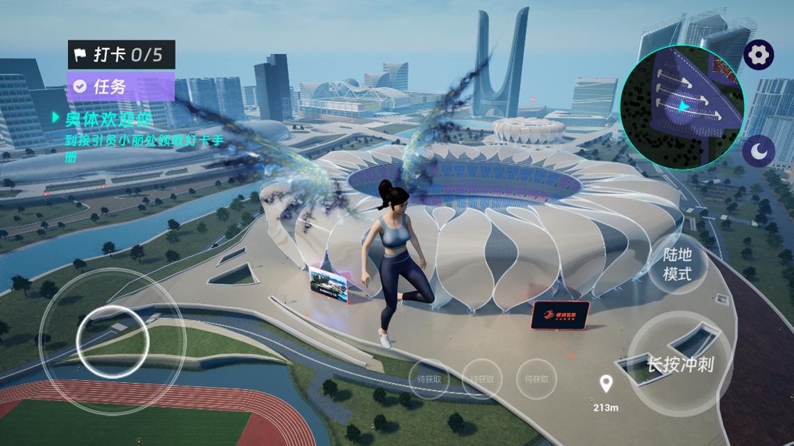 基于5G、AI人工智能、数字孪生、实时云渲染、V/AR等技术,“元上奥体”具有高精度、高清晰度、高还原度、低时延等特点。进入最新版本的“元上奥体”虚拟园区并选择角色后,用户可以在5个不同点位完成相应任务,完成五站打卡后,便可获得电商优惠券等奖品。