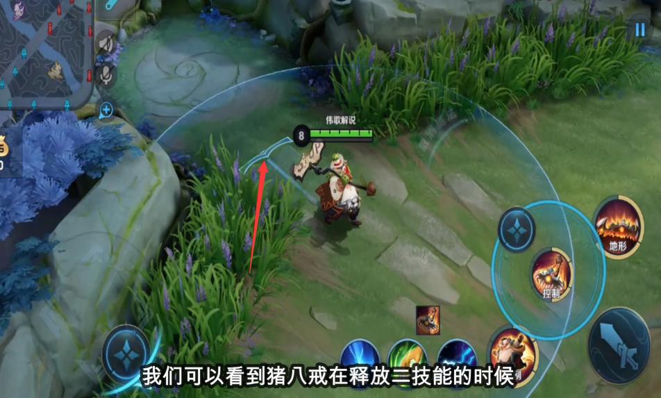 猪八戒的2技能也可以在这里进行怼人,我可以看到猪八戒在释放2技能的时候,指示器就会出现断裂的情况,也就是说这里确实有一道墙,对技能有用对英雄却没有阻挡效果。