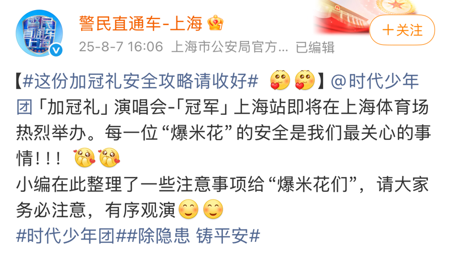 8月7日,上海警方发布提示,“衷心地希望每一位来到现场欣赏演出的观众能有一个安全、欢乐的观演感受”。
