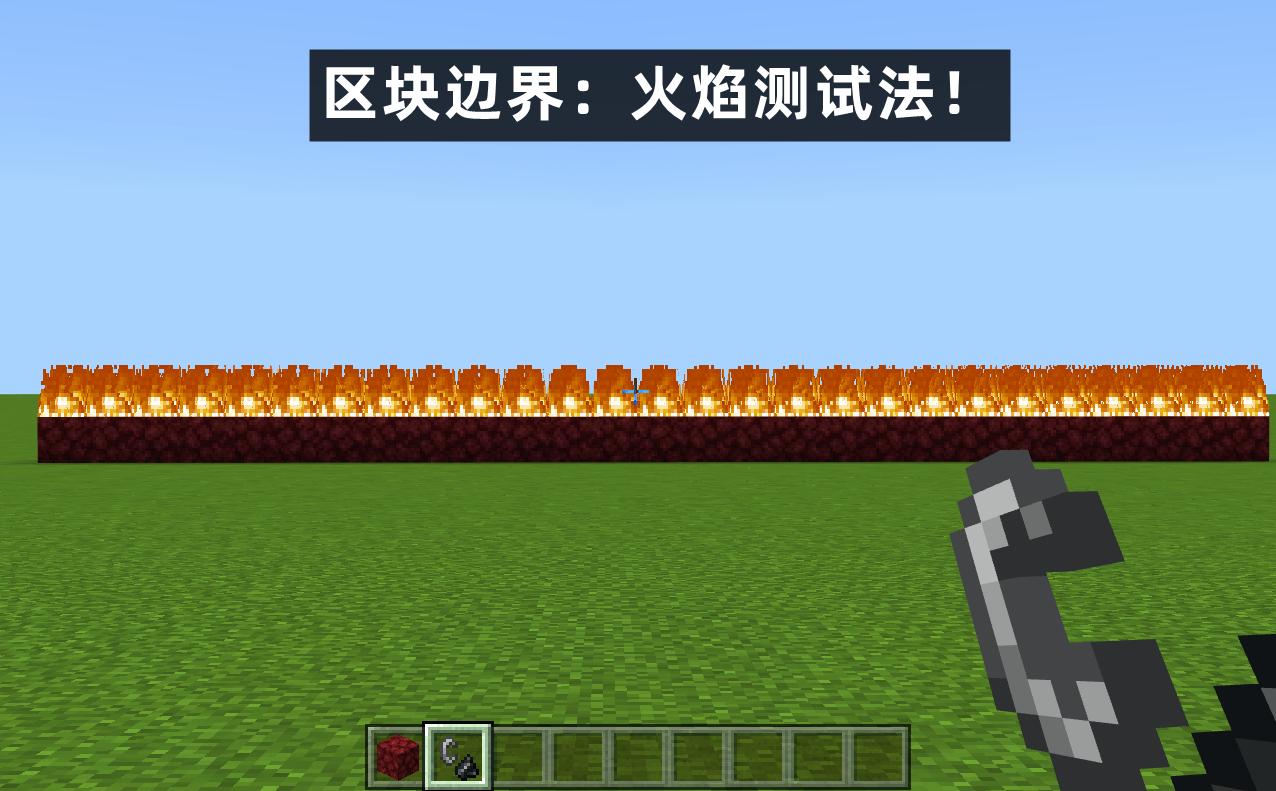 这里我们用到的方法就是火焰!此前有很多人用红石测试法,不免过于麻烦了。火焰的优势就在于它会遵循实体消失的规律。可在很短的距离观察到区块边界。