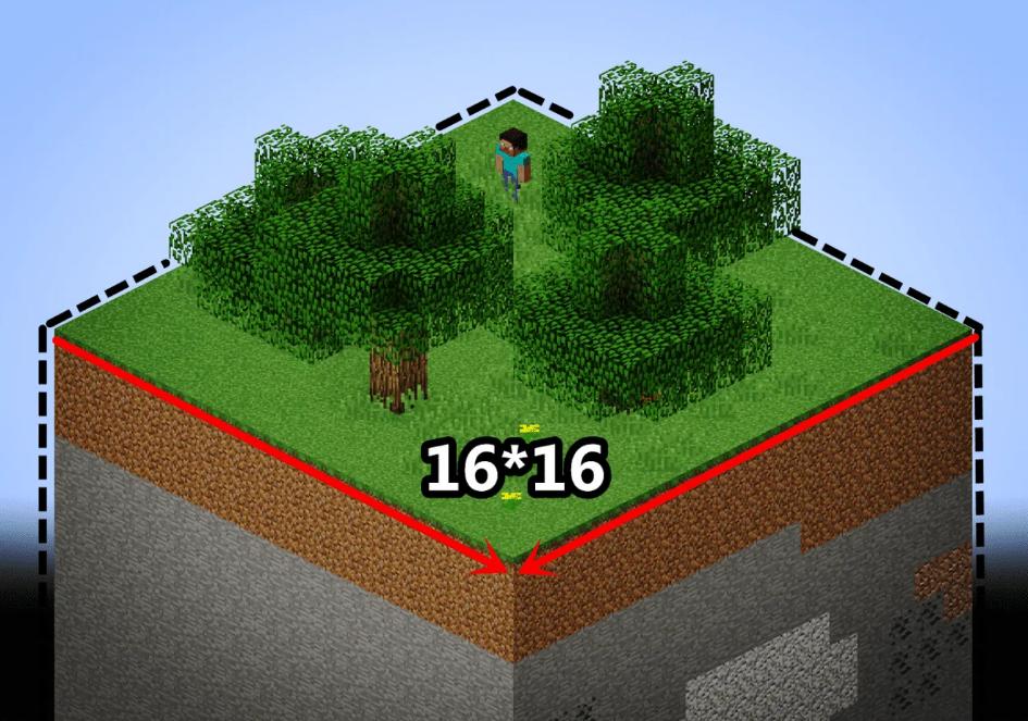 所以当我们熟知这个逻辑之后,找到坐标(16,Y,16)的这个交界点,顺着这个点无论是向前、向后、向左、向右四个方位以直线数16格,这就是一个区块边界的位置。以正方形16*16圈起来就会刚好在一个区块内。这个方式可以瞬间定位四个区块的边界和范围。