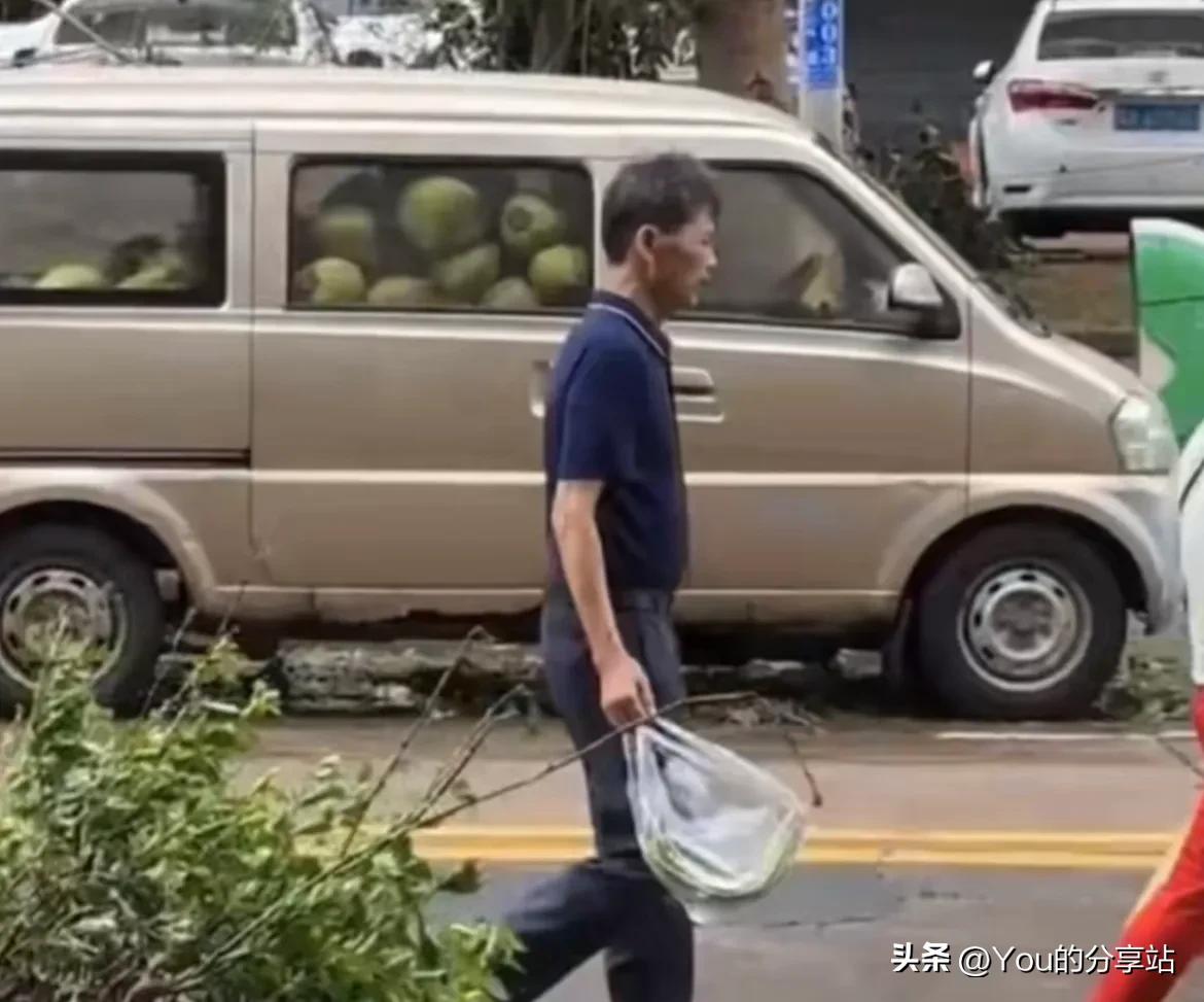 平时椰子都不会有人爬去摘,因为椰子树不好爬,这下好了台风掉到地上就可以随便捡了,也算是帮路政清理路面了