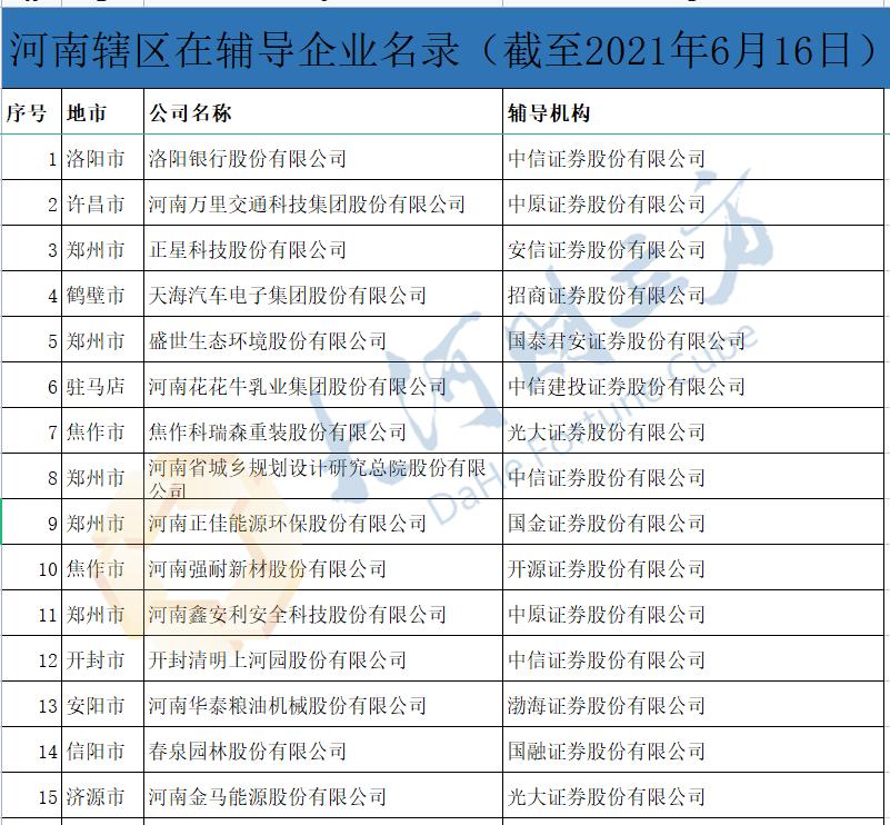 【大河财立方消息】6月17日,记者从河南省证监局网站获悉,河南辖区在辅导企业最新名录公布,河南省共计44家在辅导企业。